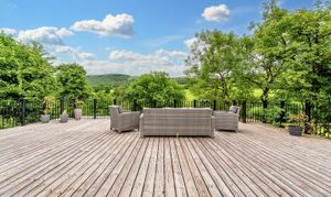Two stunning terraces invite you to relax and enjoy; the decked terrace with splendid views over the valley and meandering river below offers a seating area, ideal for entertaining, eating Alfresco and socialising.