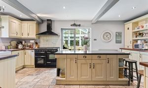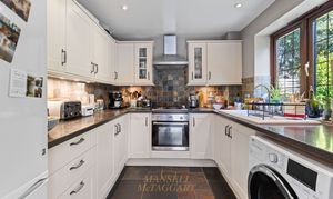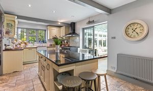 The living space briefly encompasses a generous living room, with dual aspect windows and feature fireplace, and a separate kitchen/dining area. here there is a grand dining space easily accommodating an 8+ person dining table, and a kitchen/breakfast area with tasteful wall and base units, a large blue/black granite island with other worktops being iroko wood and a host of fitted and freestanding appliances with the flooring laid with silver travertine flagstones. Doors also lead to the conservatory with triple aspect windows and doors to garden laid with Old London sandstone flagstones, and a utility room with butler sink and further appliances along with plumbing for 2 washing machines with a separate tumble dryer, plus extra fridge freezer, oak worktop and cupboards above with a convenient pantry also available. Completing the downstairs, there is a well proportioned double bedroom with an en-suite.