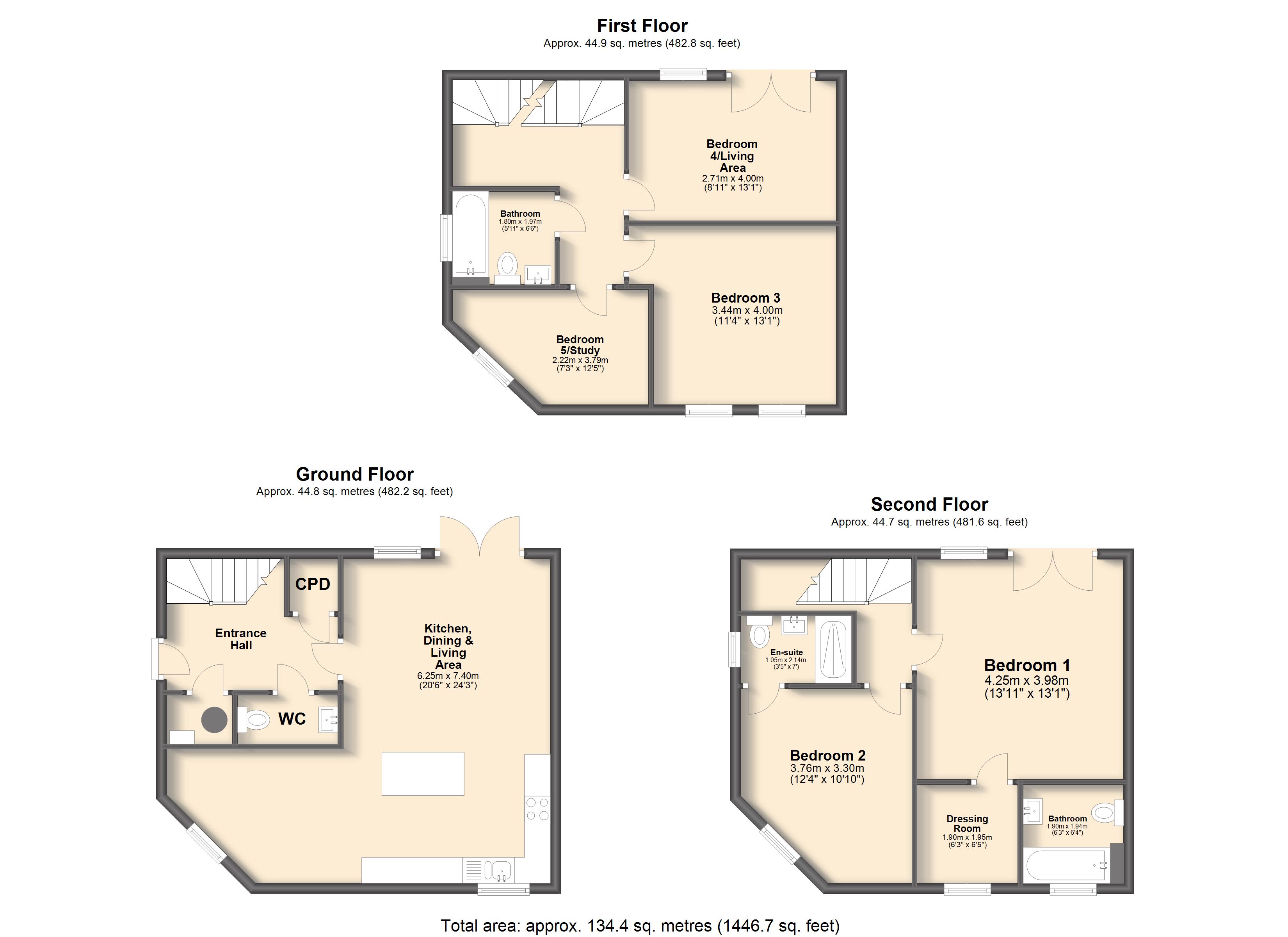 The first floor comprises three bedrooms and a family bathroom, or perhaps you’d prefer a second sitting room and study! The second floor is the principal suite complete with spacious bedroom, en-suite shower room and dressing room. This floor also includes a second double bedroom with en-suite. The homes unique corner position allows for triple aspect views.