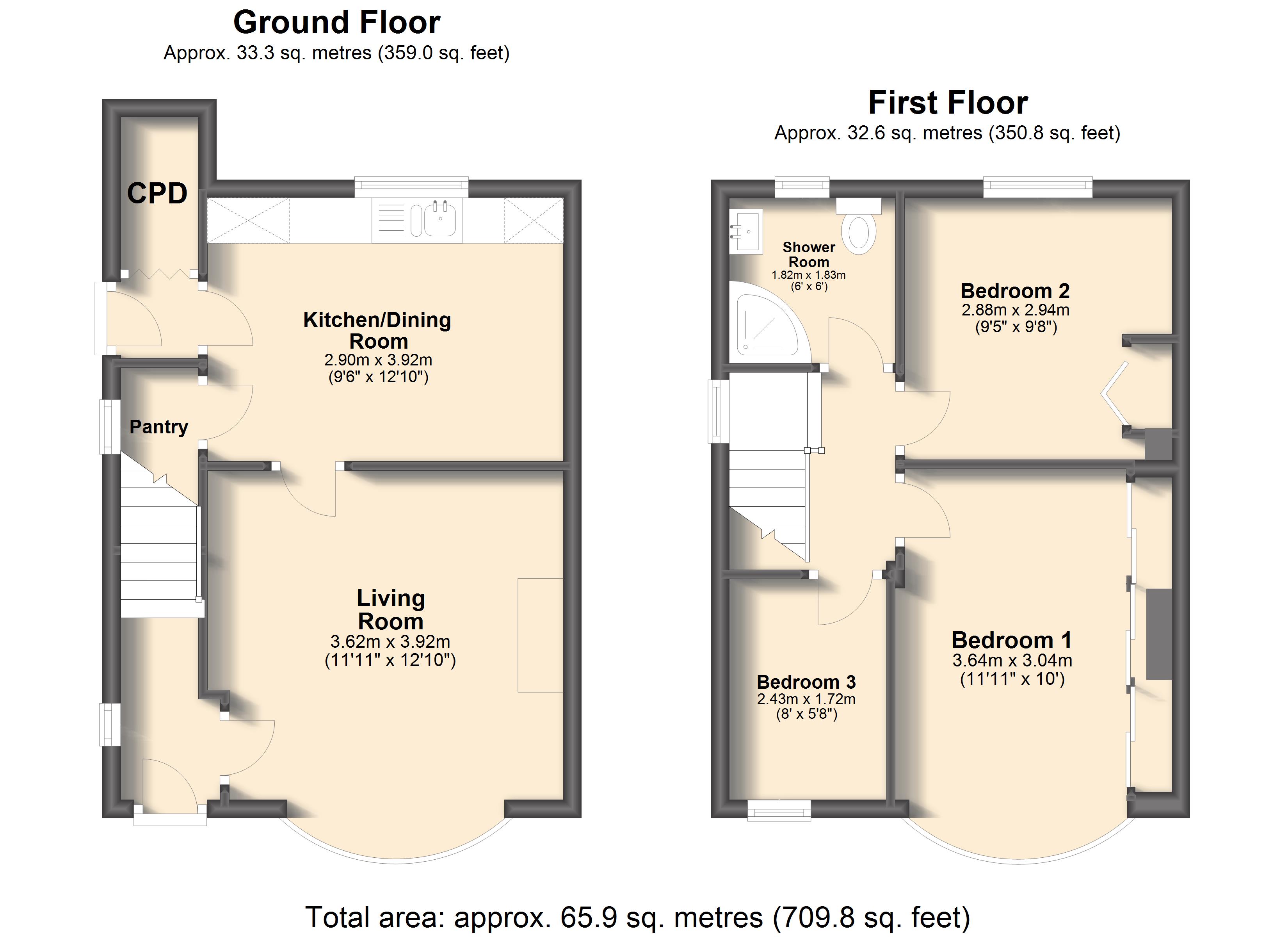The ground-floor features a spacious, bay-windowed living room, providing a well-proportioned and versatile reception space. To the rear, an open-plan kitchen and dining area offers a practical layout for everyday living and entertaining, complemented by a useful ground-floor pantry store for additional storage.