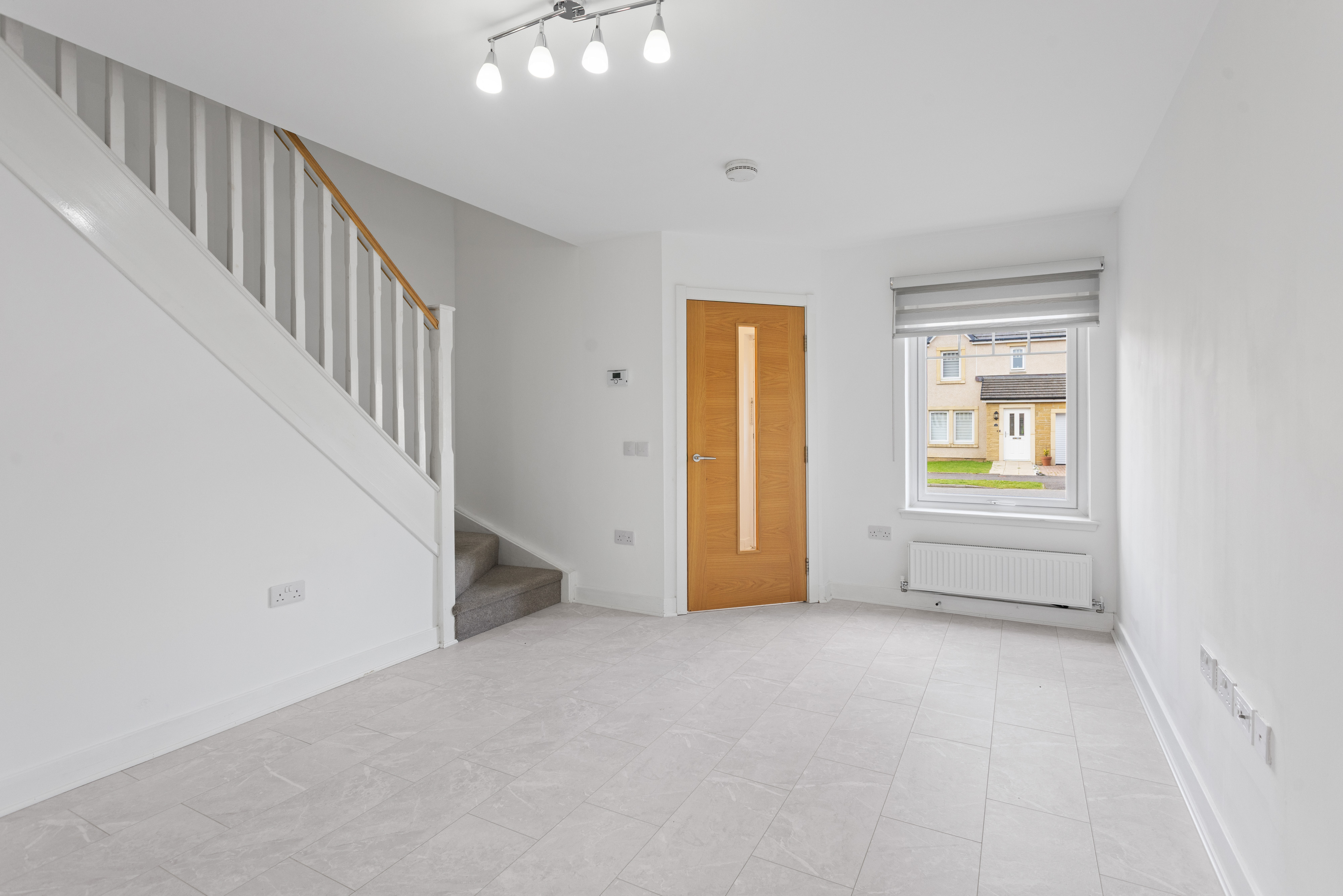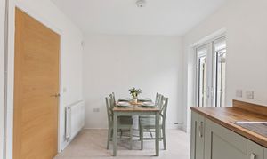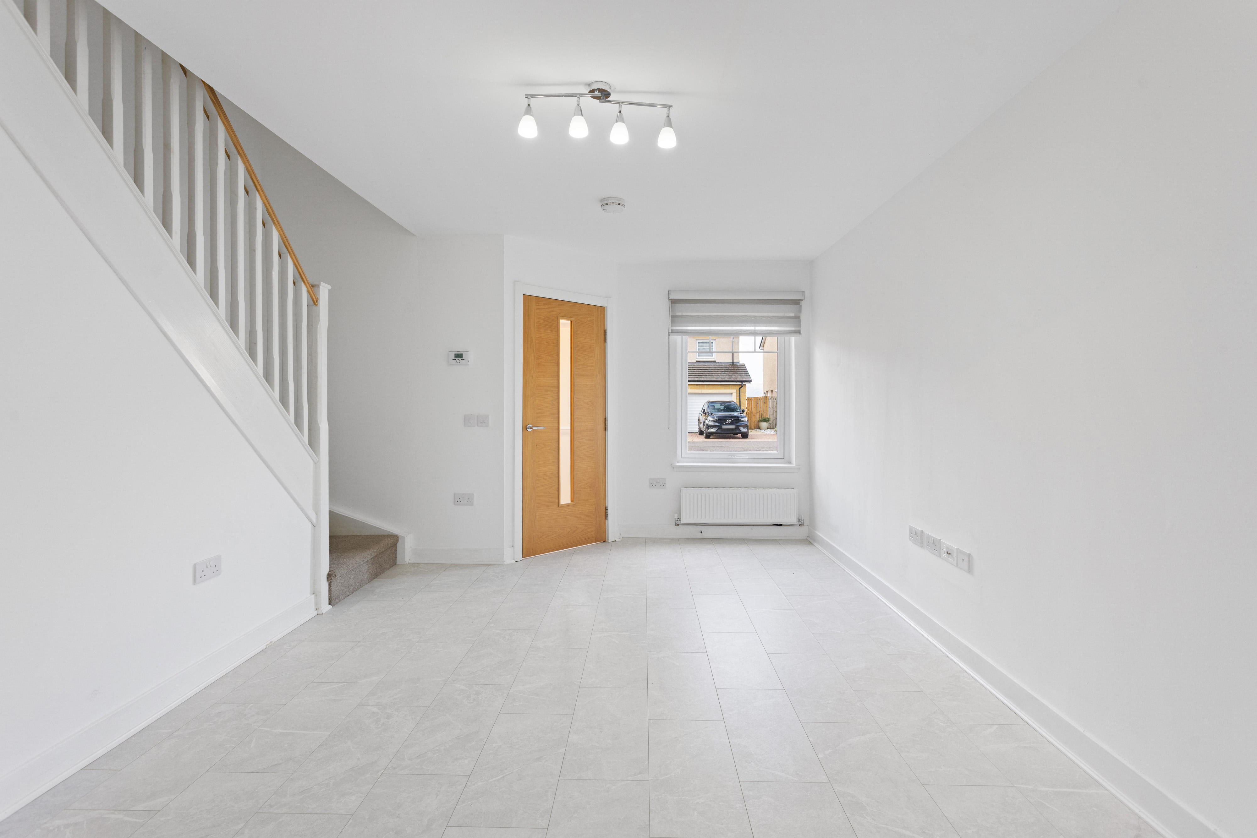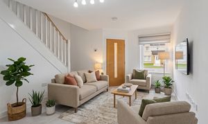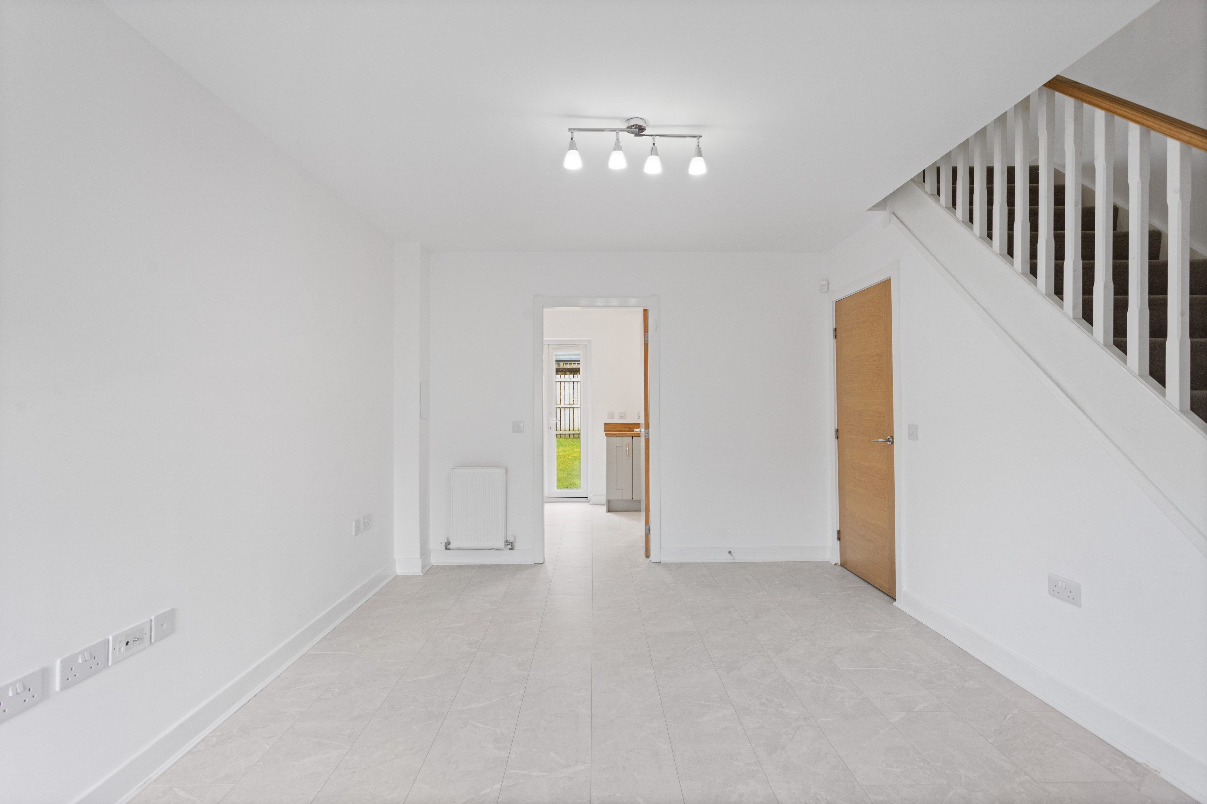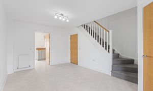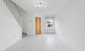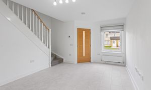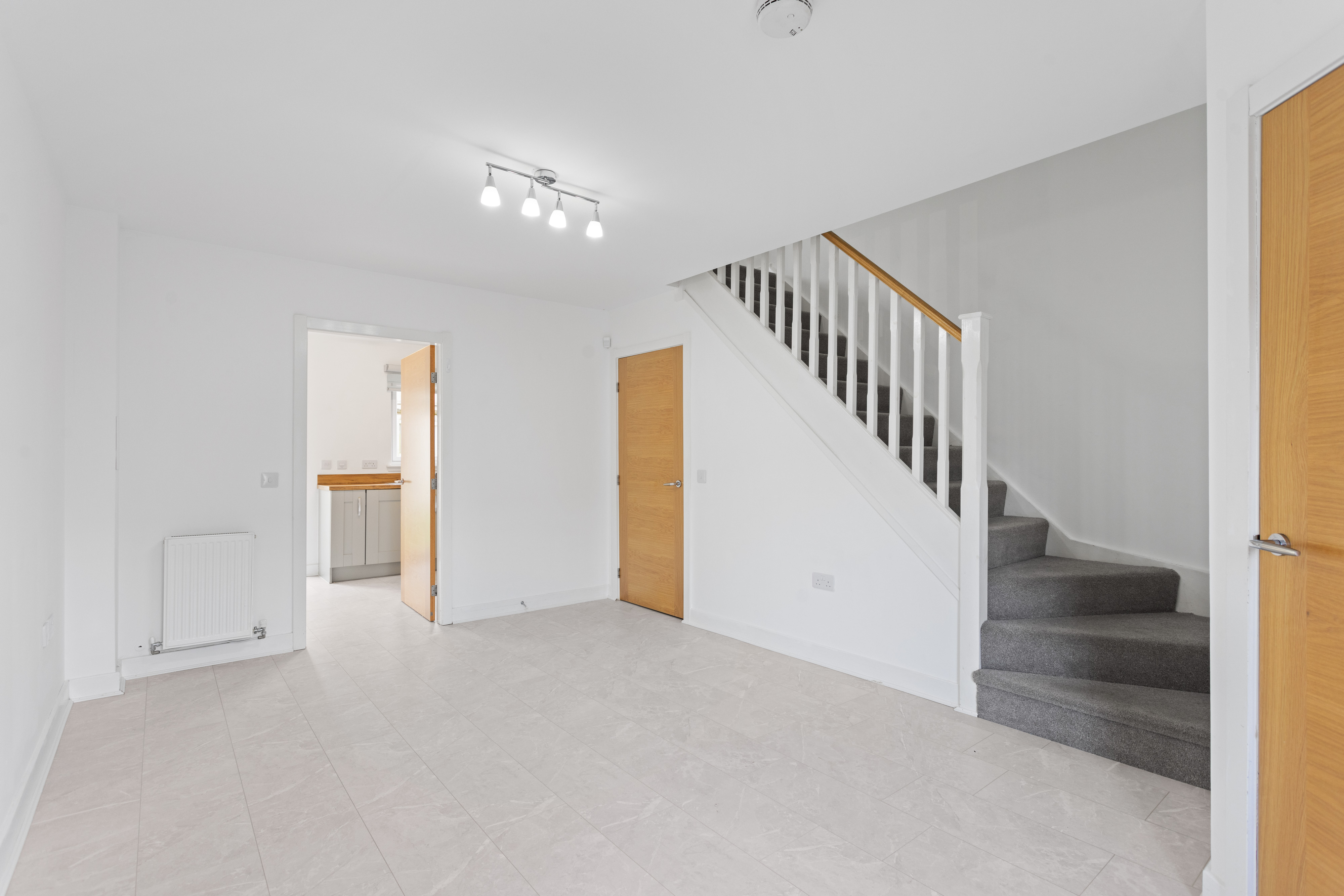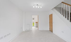 Moving through, the home opens into a spacious lounge, beautifully presented with light grey wood effect flooring that continues throughout the ground floor, enhancing both the sense of space and practicality. The décor is fresh and neutral, complemented by modern ceiling lighting and a large front facing window that fills the room with natural light. The staircase, with its light wood handrail and white balustrade, provides a subtle contrast, while useful under stair space offers additional storage potential.