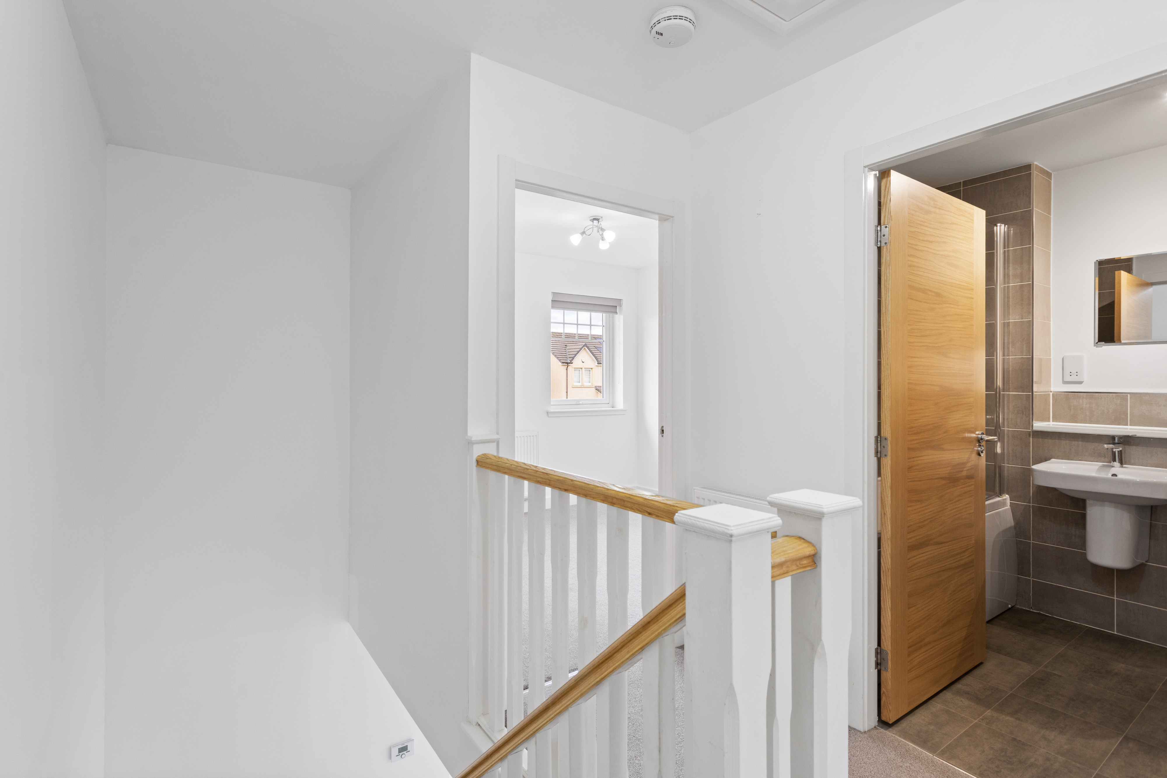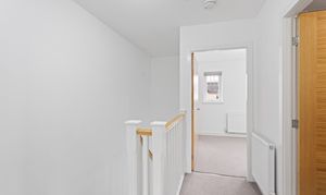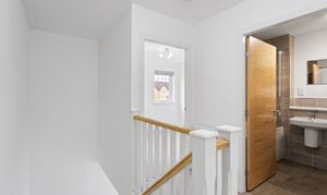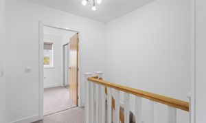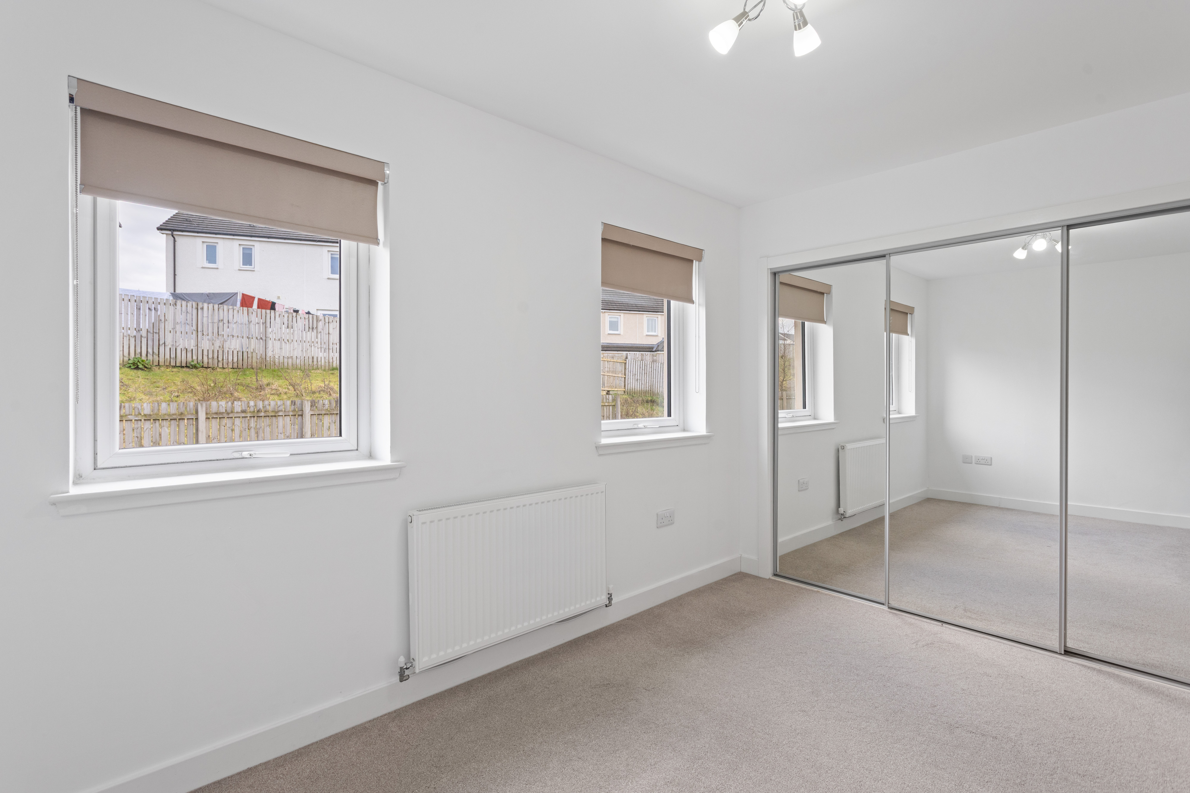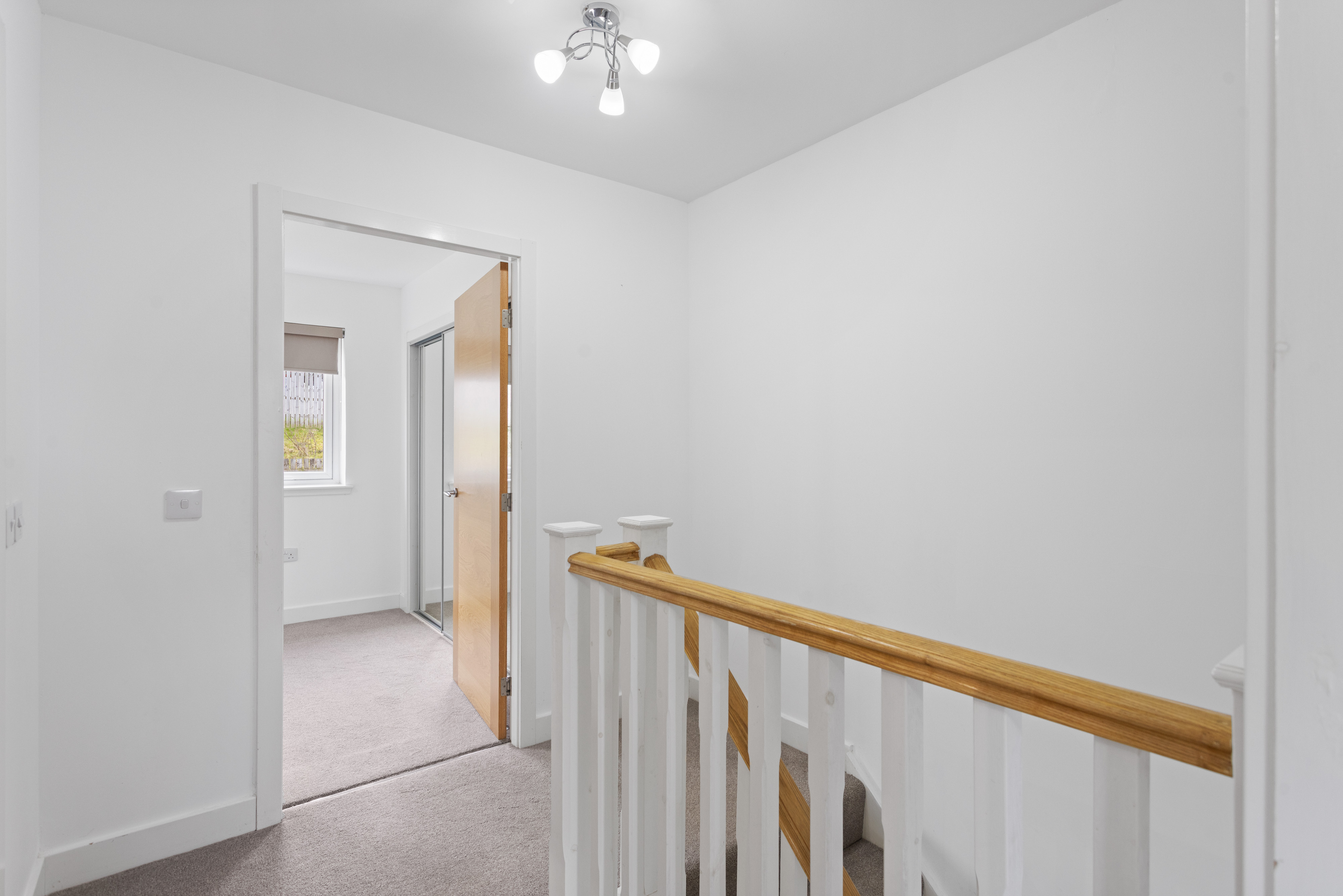Upstairs, the landing is bright and airy, leading to two well proportioned bedrooms. The principal bedroom is particularly impressive, featuring plush neutral carpeting and a large window that enhances the sense of space and light. Built in mirrored wardrobes provide excellent storage while reflecting light throughout the room, further amplifying the feeling of openness.