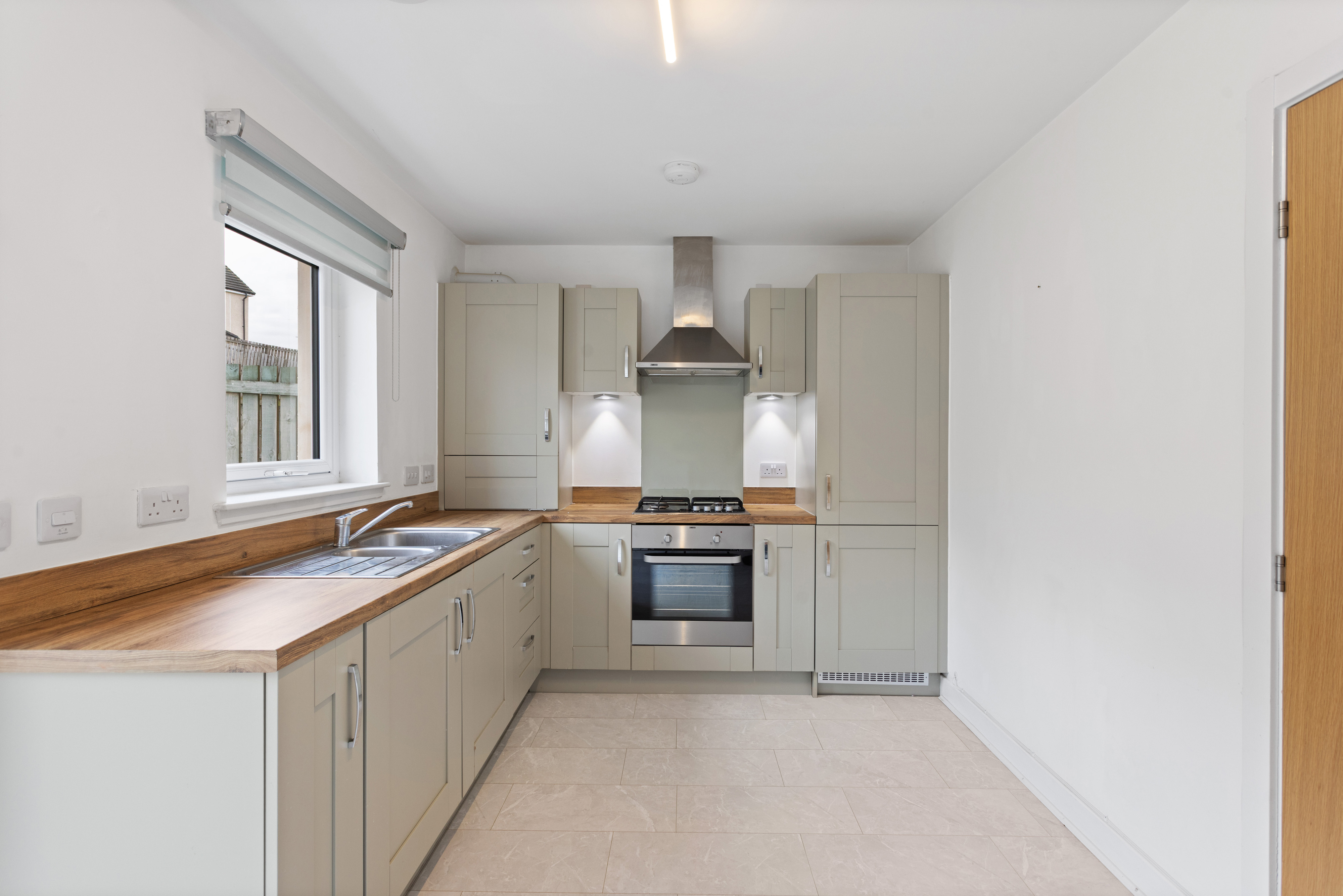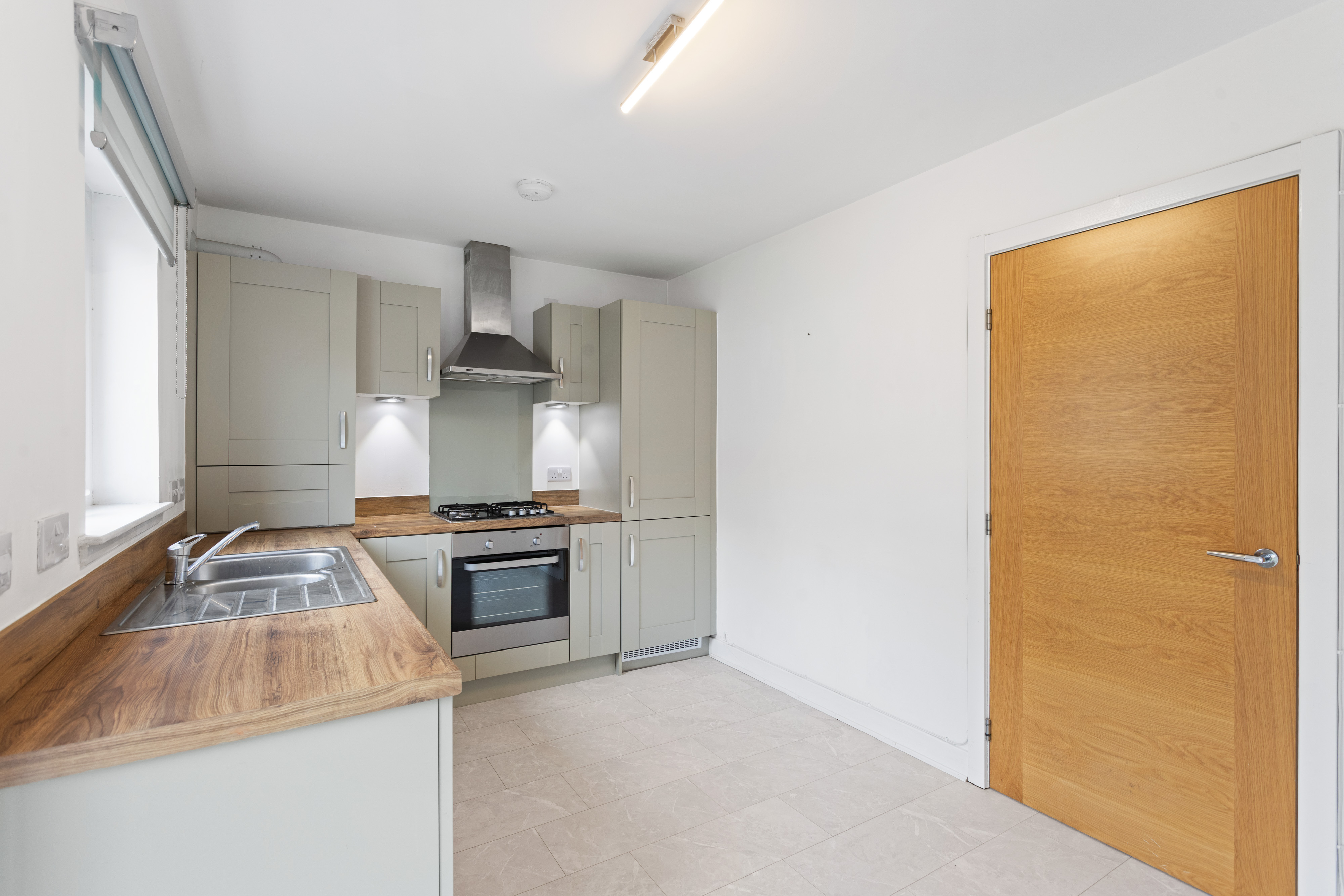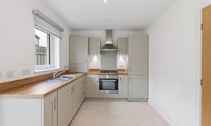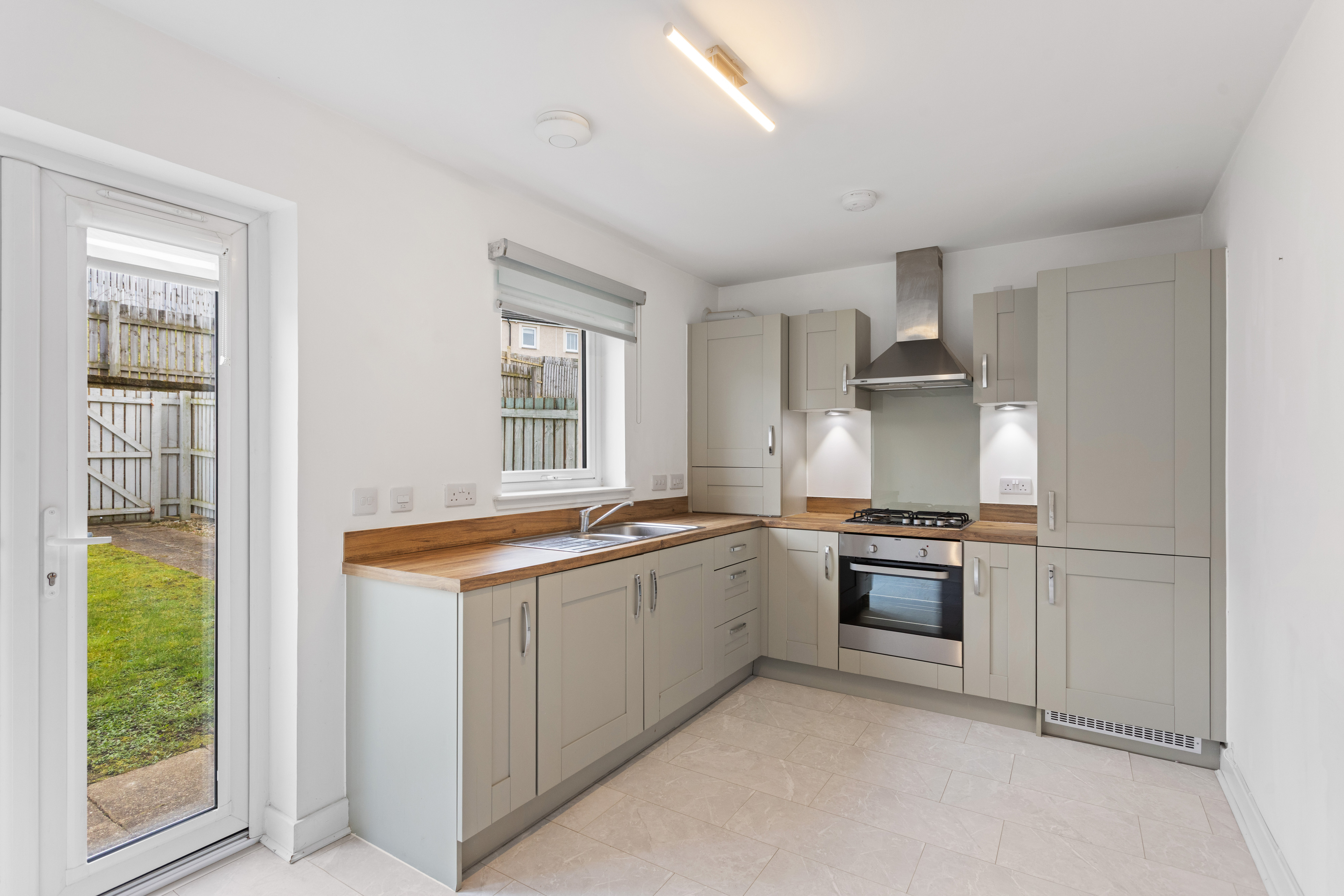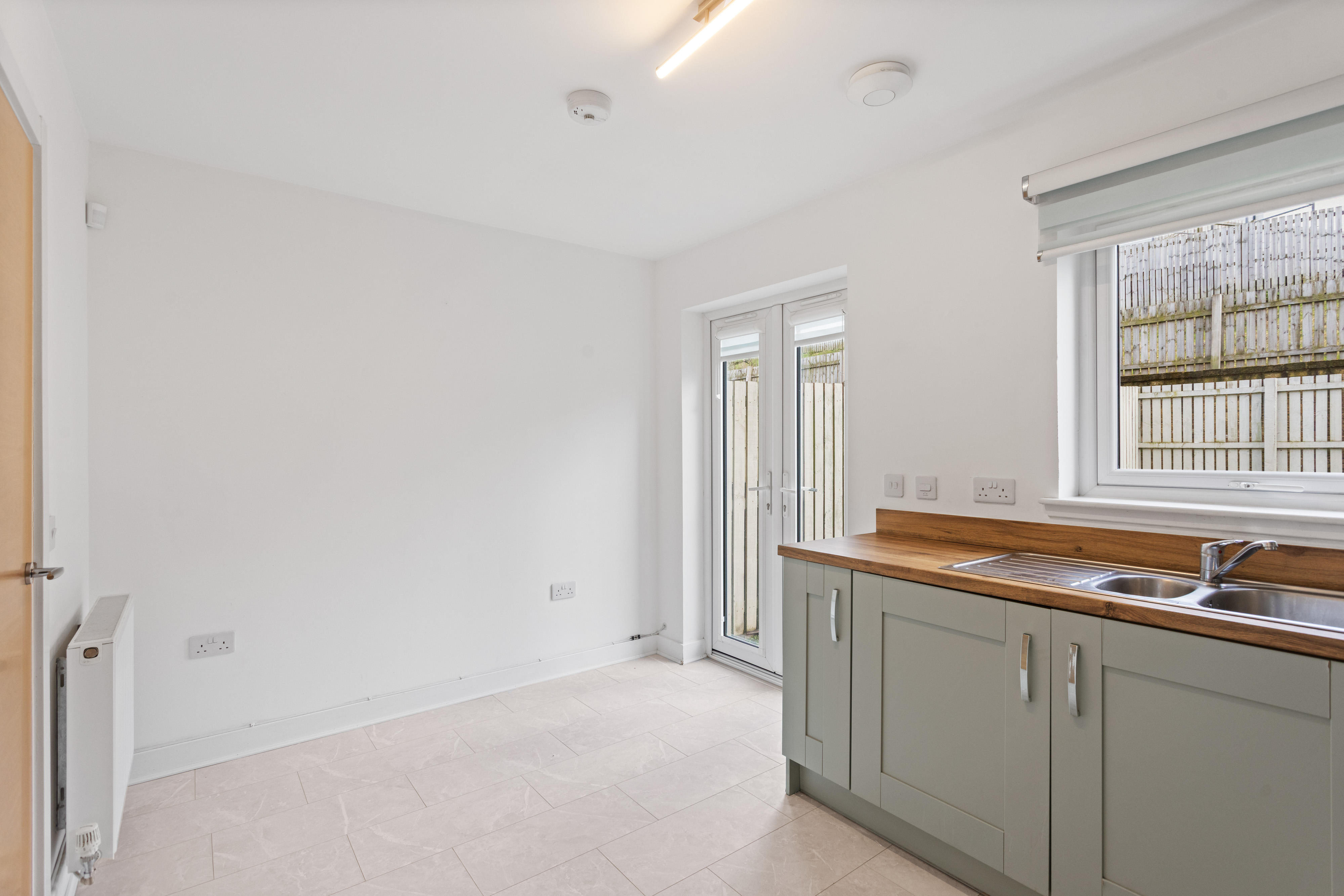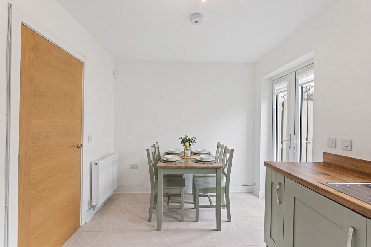To the rear, the lounge flows seamlessly into the open plan kitchen and dining area, the true heart of the home. The kitchen is thoughtfully designed with contemporary shaker style cabinets in a soft, muted tone, perfectly paired with warm wood effect worktops that add both texture and warmth. Integrated appliances, including an oven, hob and extractor, are neatly built in, while generous countertop space ensures practicality for everyday cooking. The continuation of the wood effect flooring makes this space both stylish and easy to maintain. There is ample room for dining, creating a sociable area ideal for entertaining or family meals. French doors, alongside a large window, flood the room with natural light and provide direct access to the private south east facing rear garden, enhancing the connection between indoor and outdoor living.