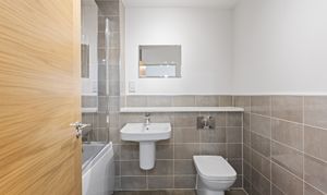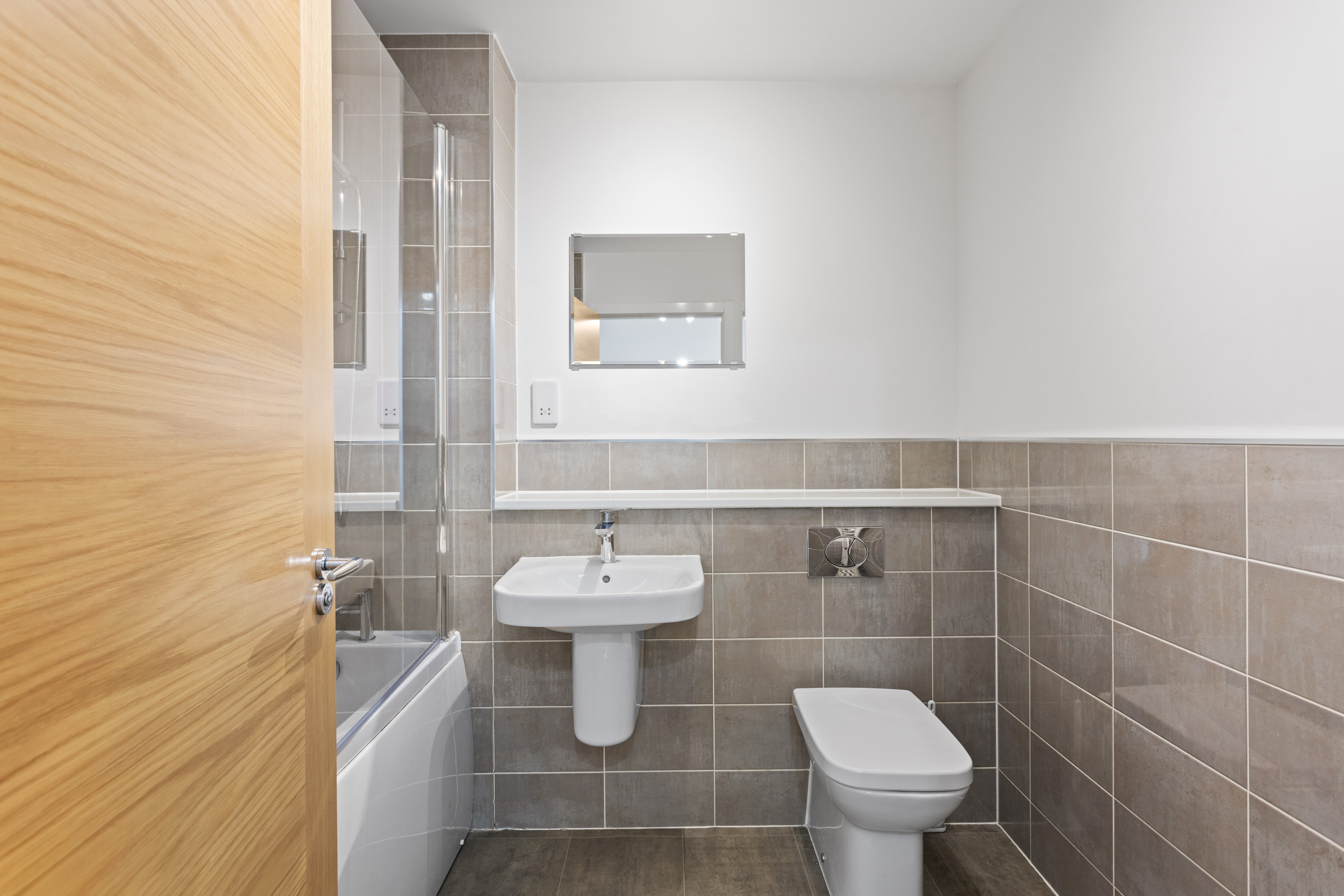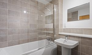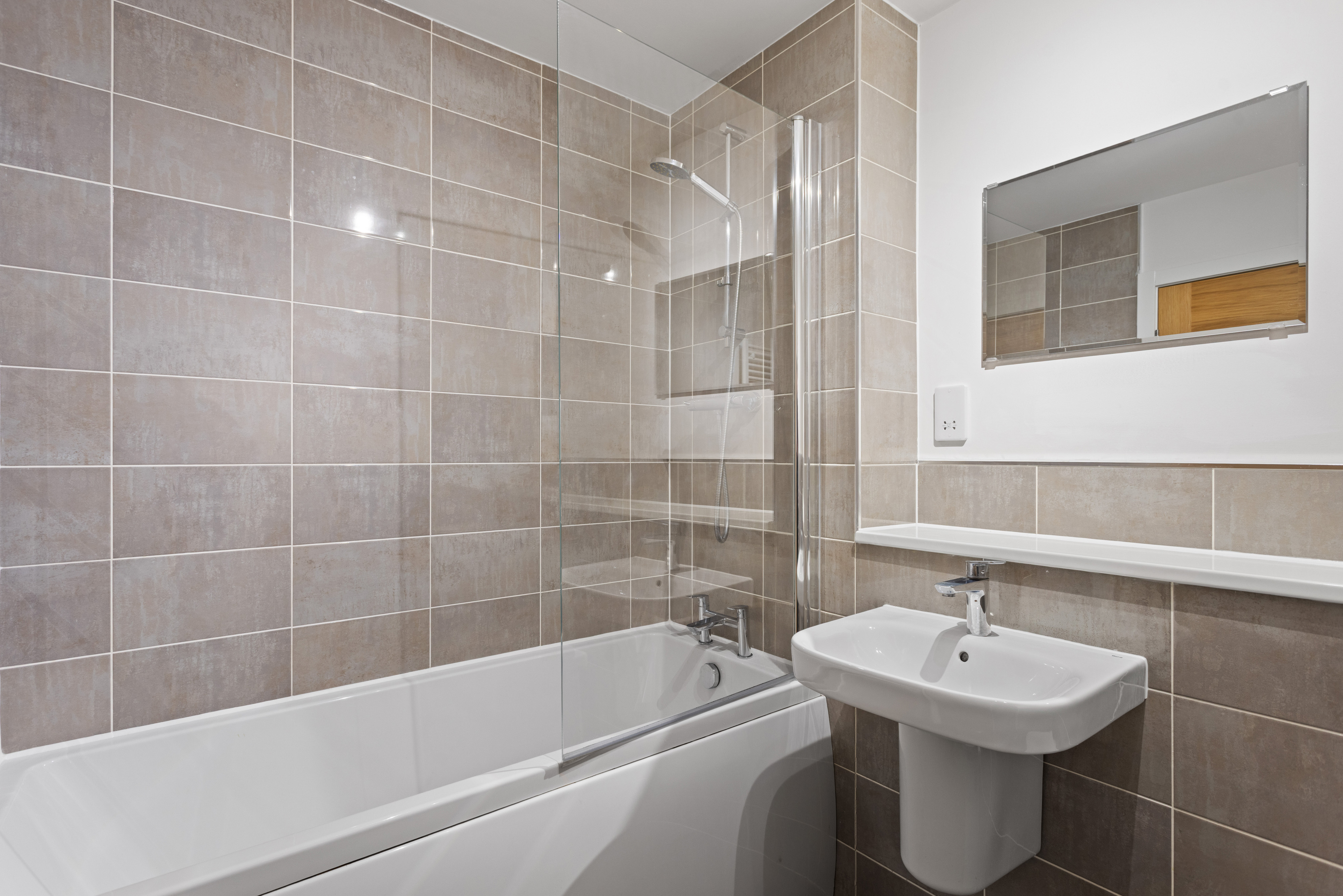 The bathroom is finished to a high standard, with stylish full height neutral tiling. It features a modern suite including a bath with overhead shower and glass screen, a sleek wall mounted sink, and quality fittings that create a polished, contemporary look while remaining practical for daily use.