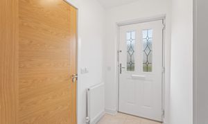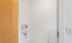 Step inside and you’re welcomed into a bright entrance hallway, where crisp white walls and light toned wood effect flooring immediately create a clean, contemporary feel. A convenient ground floor WC is positioned just off the hallway, finished with modern fittings and neutral décor, ideal for guests and everyday use.