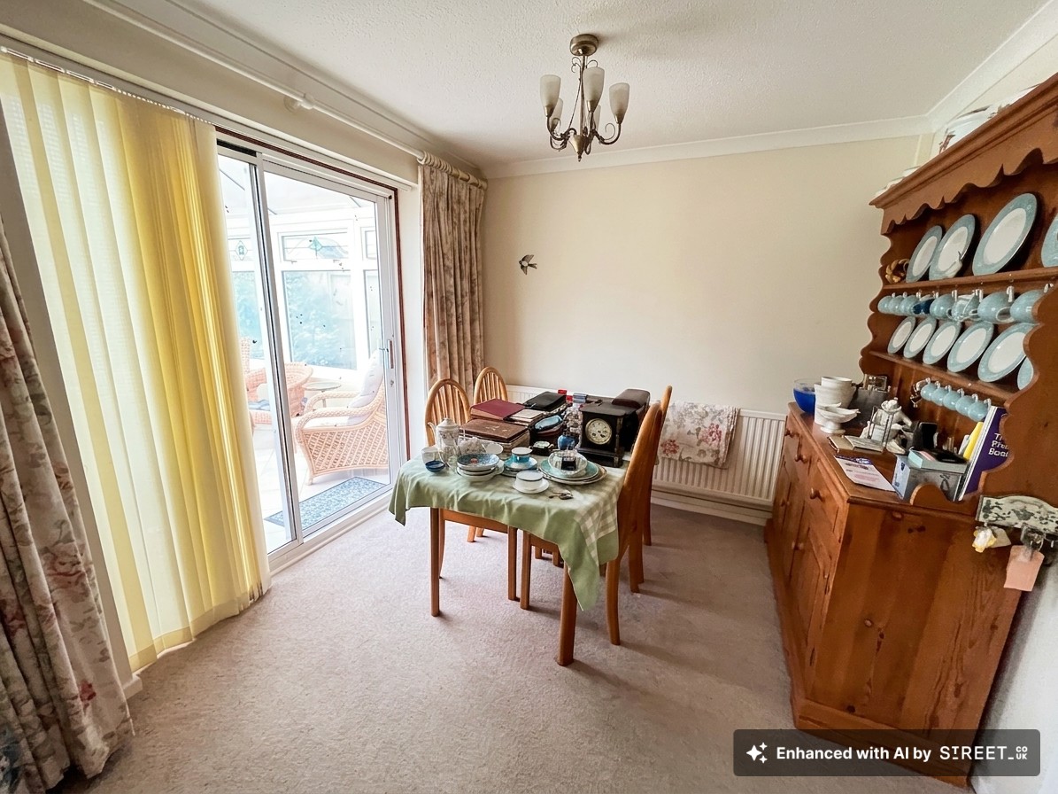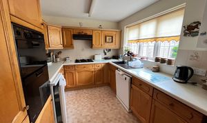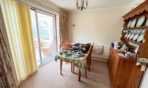 Kitchen with sink overlooking garden. Space for dishwasher and fridge. Built in double oven, gas hob with extractor over. Dining Room area with sliding patio doors to;