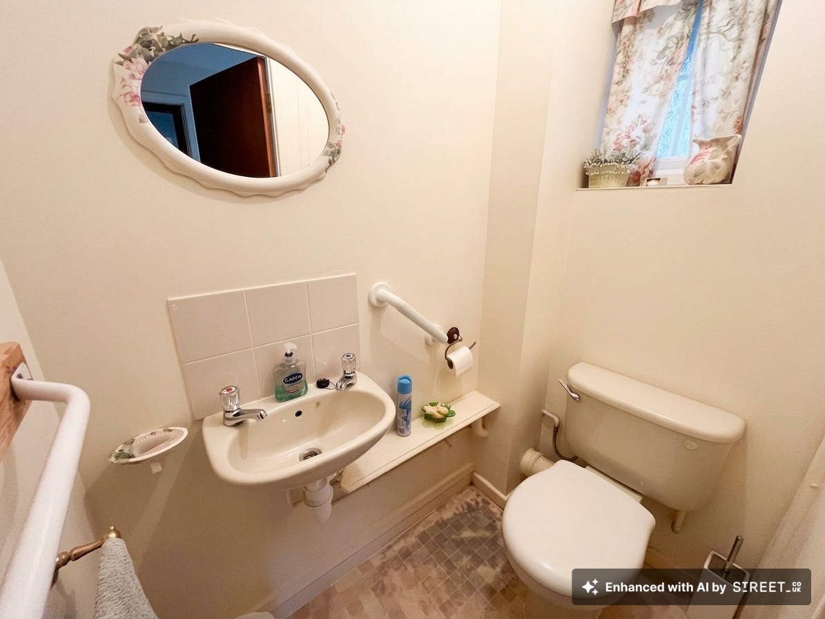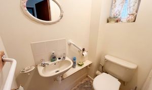 Downstairs WC with hand wash basin, radiator and window to side.