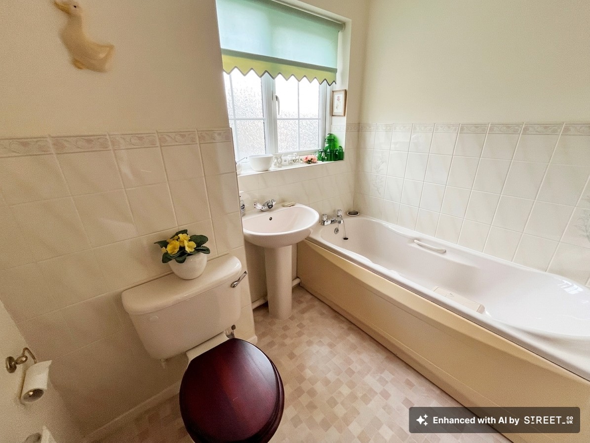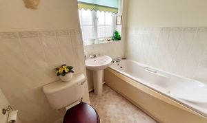 Bathroom with obscured UPVC window to side. Three piece suite comprising; bath, WC and hand wash basin.
