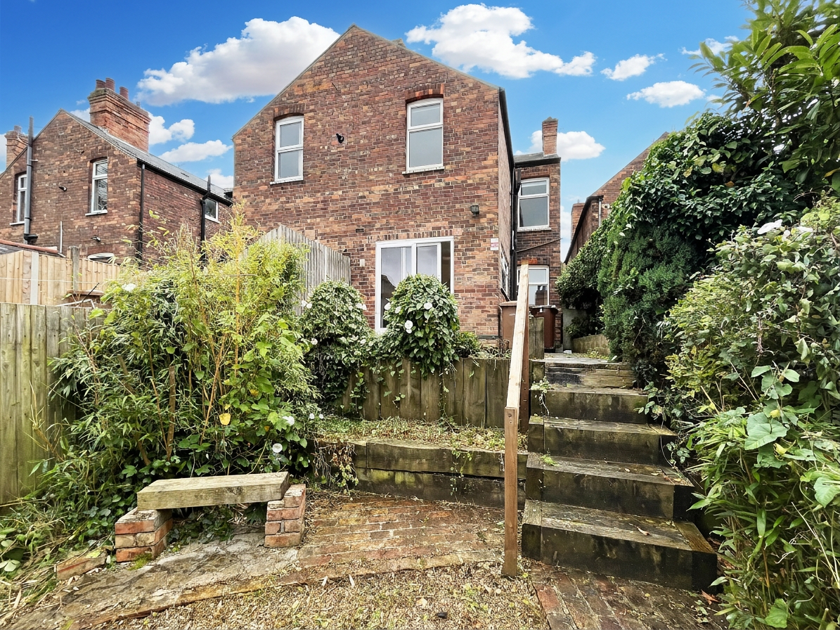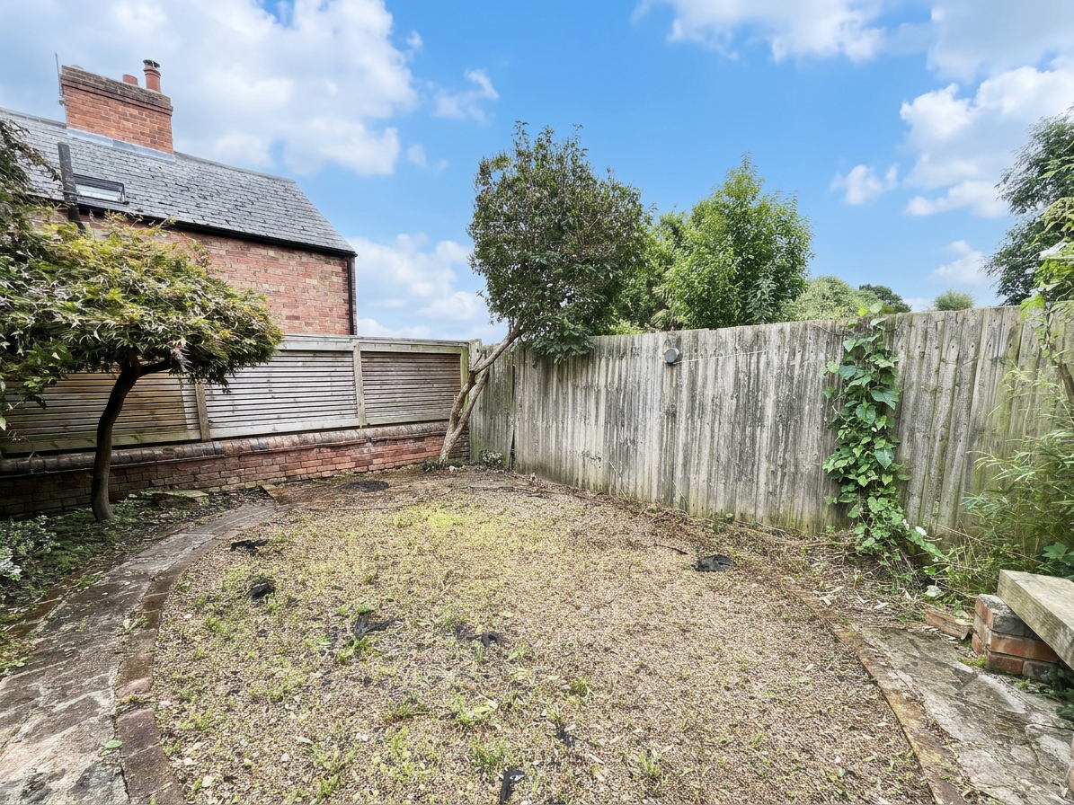 Outside, the garden enjoys an elevated patio area leading down to a lawn with established planting.