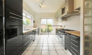 - Stylish kitchen with black high gloss units and a breakfast bar
