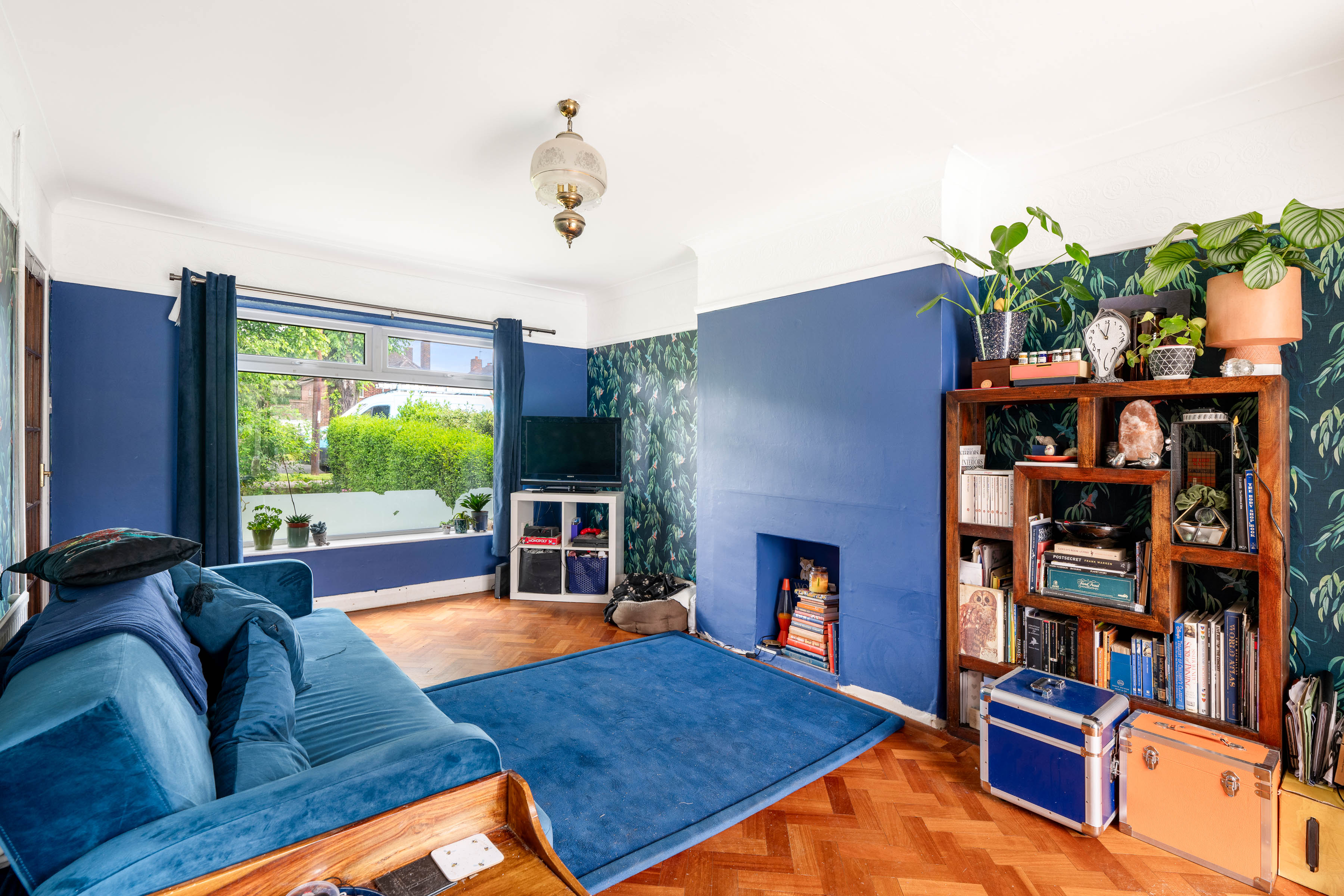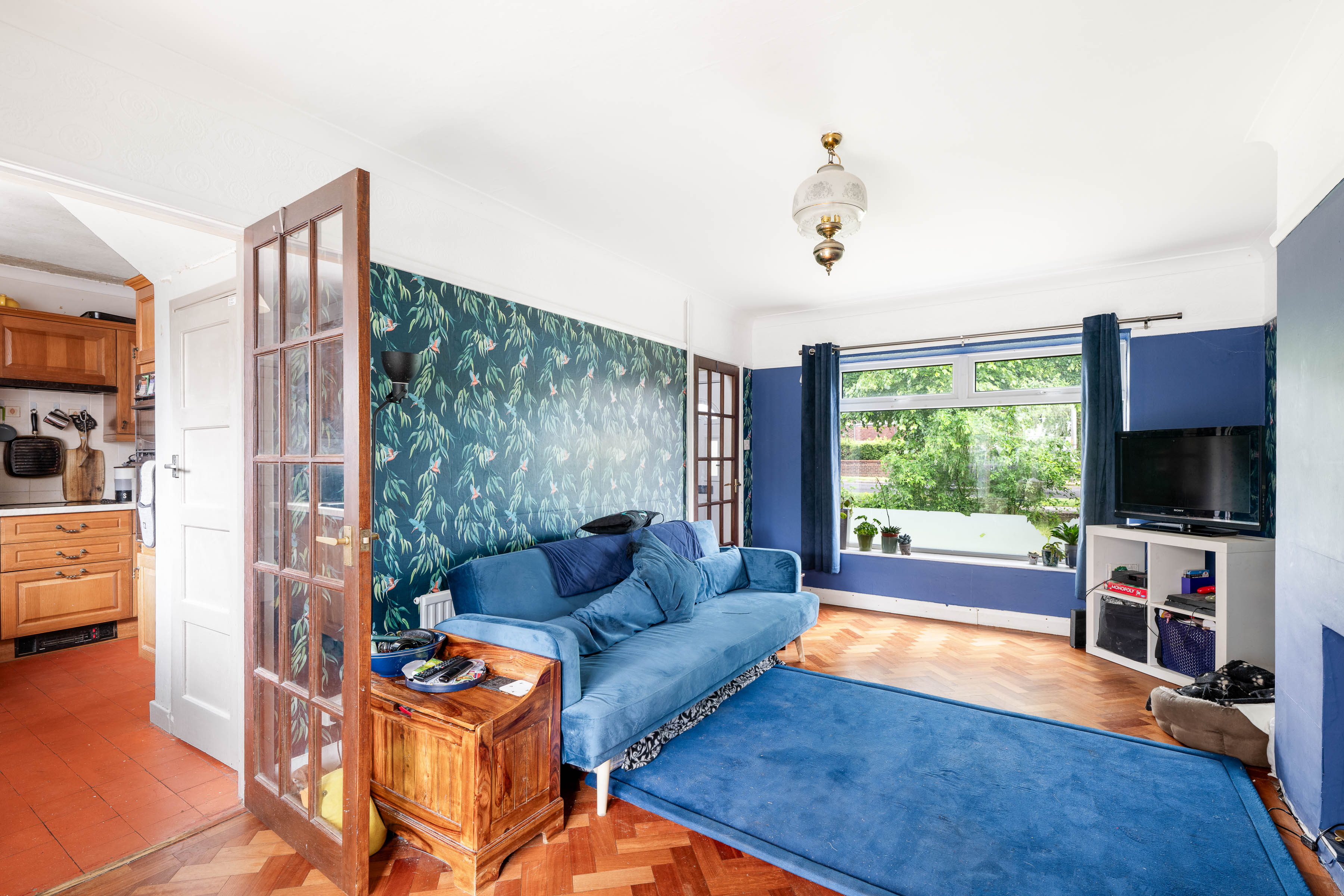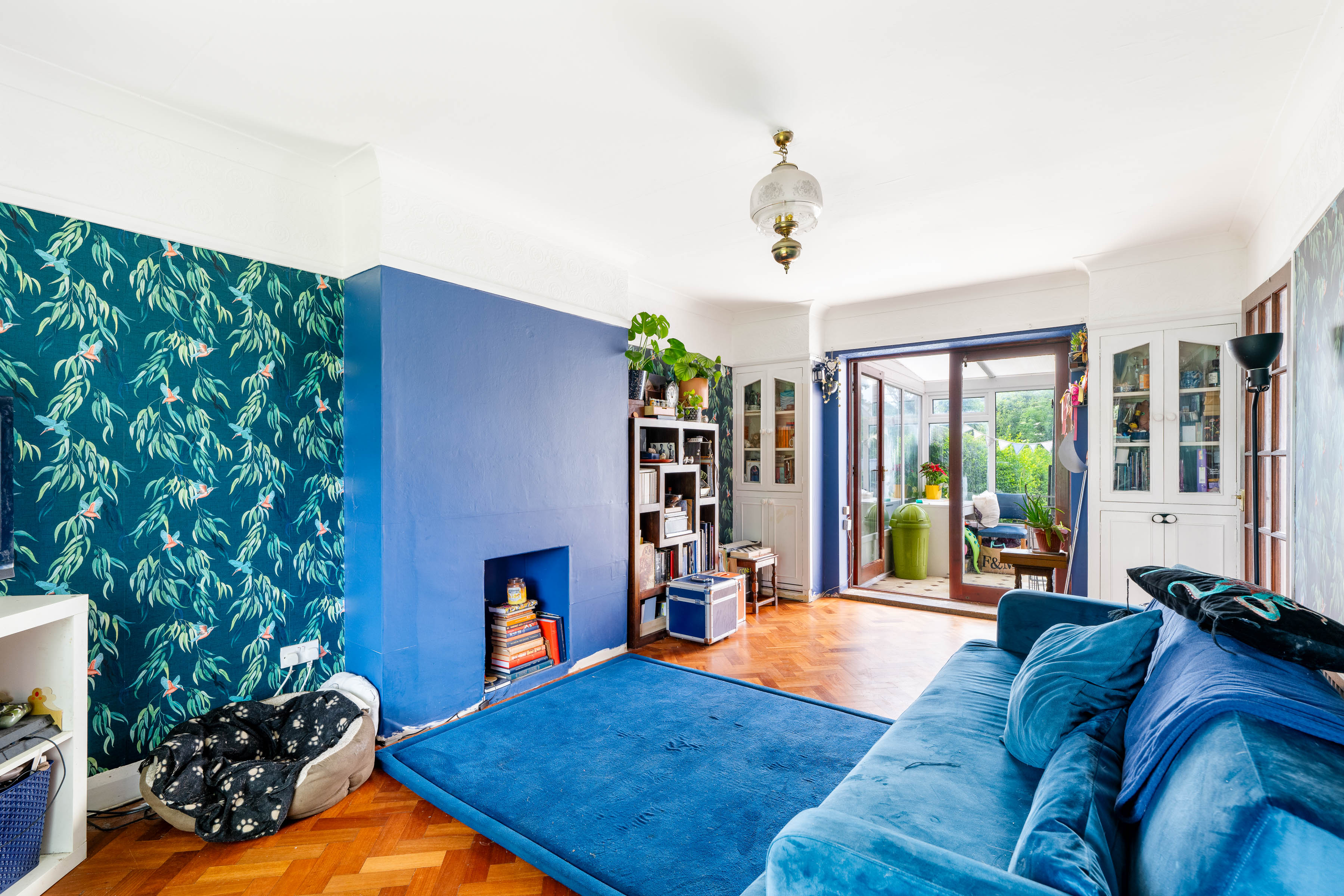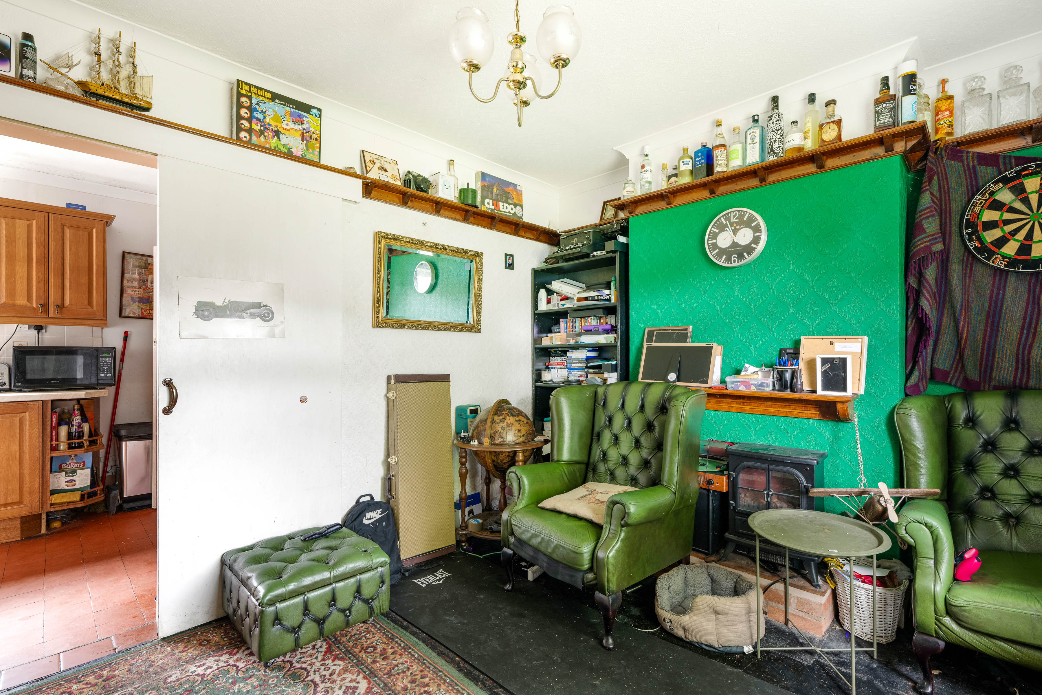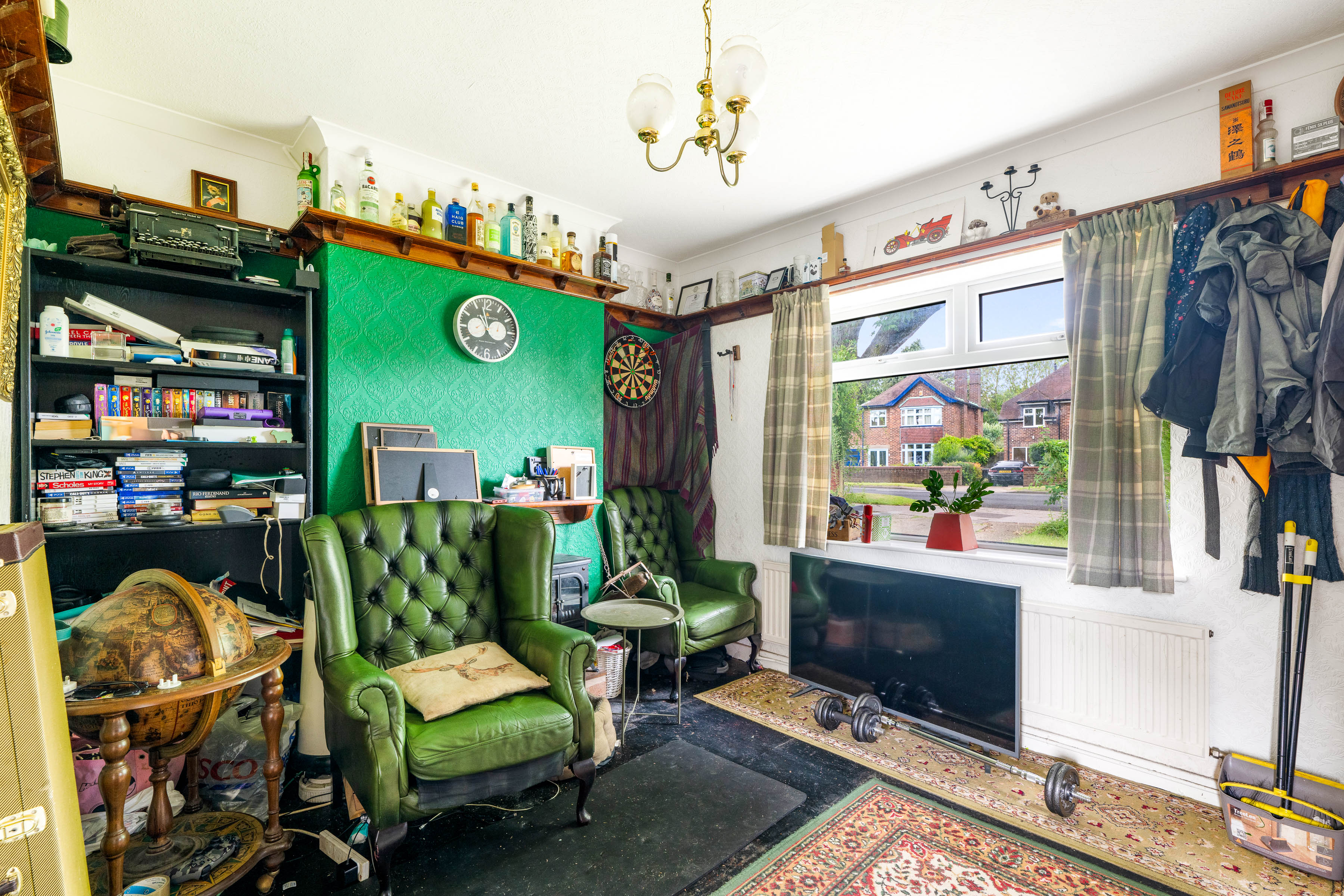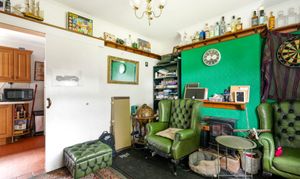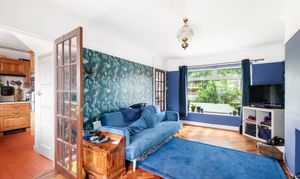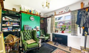 Double glazed window to front aspect, reclaimed wood parquet flooring, radiator, built in storage/display cabinets, picture rail, double doors to conservatory.