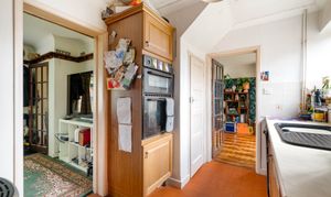 Being fitted with a range of eye level wall and base units with contrasting work surfaces fitted over, double oven with grill, 4 ring electric hob and extractor hood over (and foot warming vent under!), sink with drainer and mixer tap over, double glazed window to rear aspect, space and plumbing for dishwasher, built in refrigerator unit, under stairs cupboard.