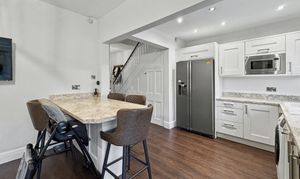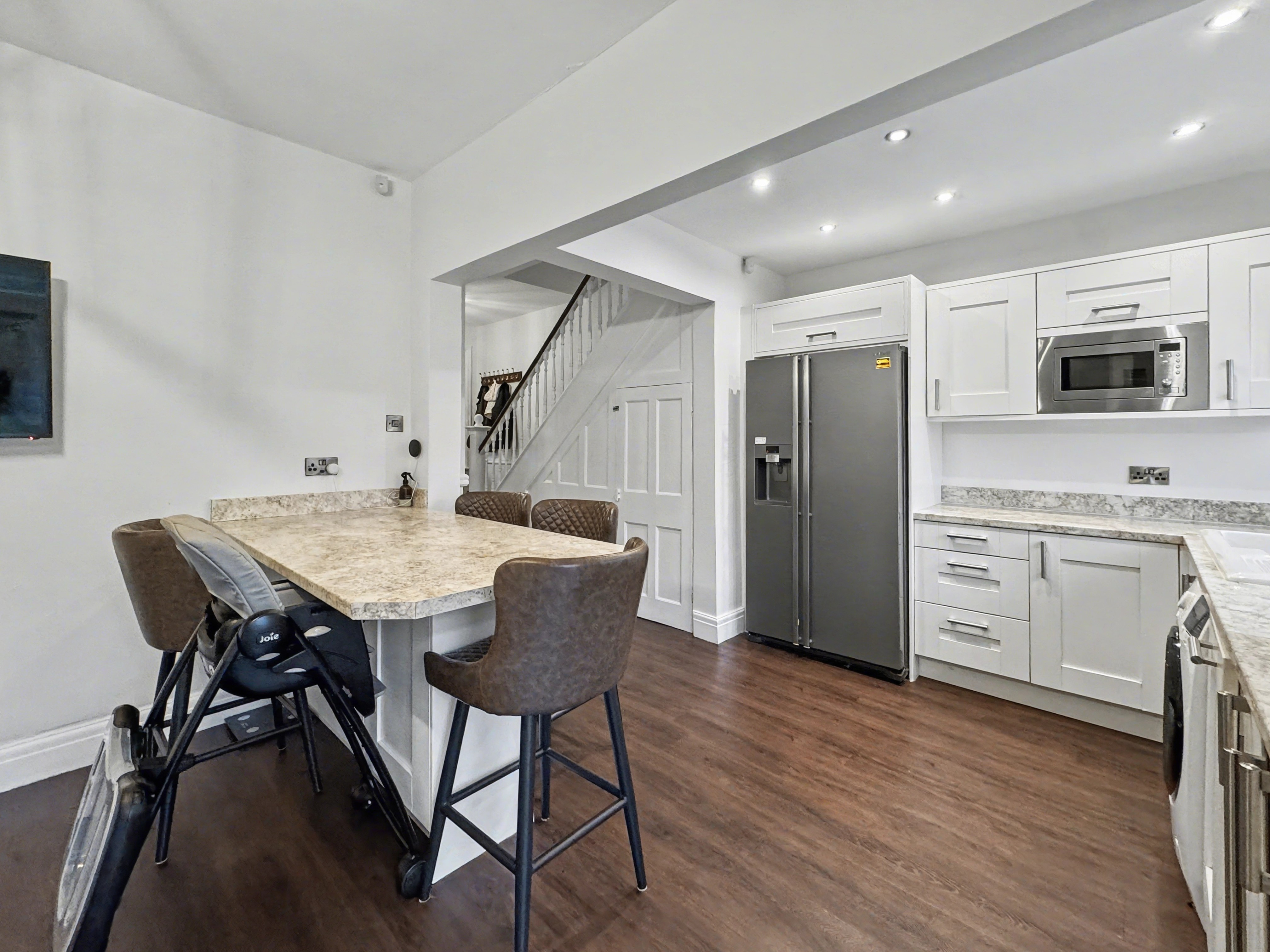 The accommodation briefly comprises an entrance porch leading into a spacious hallway, a welcoming lounge featuring a bay window and attractive fireplace, and a generous open-plan kitchen diner fitted with premium units and work surfaces. The kitchen is well equipped with a six-seater breakfast bar, space for a range-style cooker, integrated wine cooler, American-style fridge freezer, washing machine and dishwasher.
