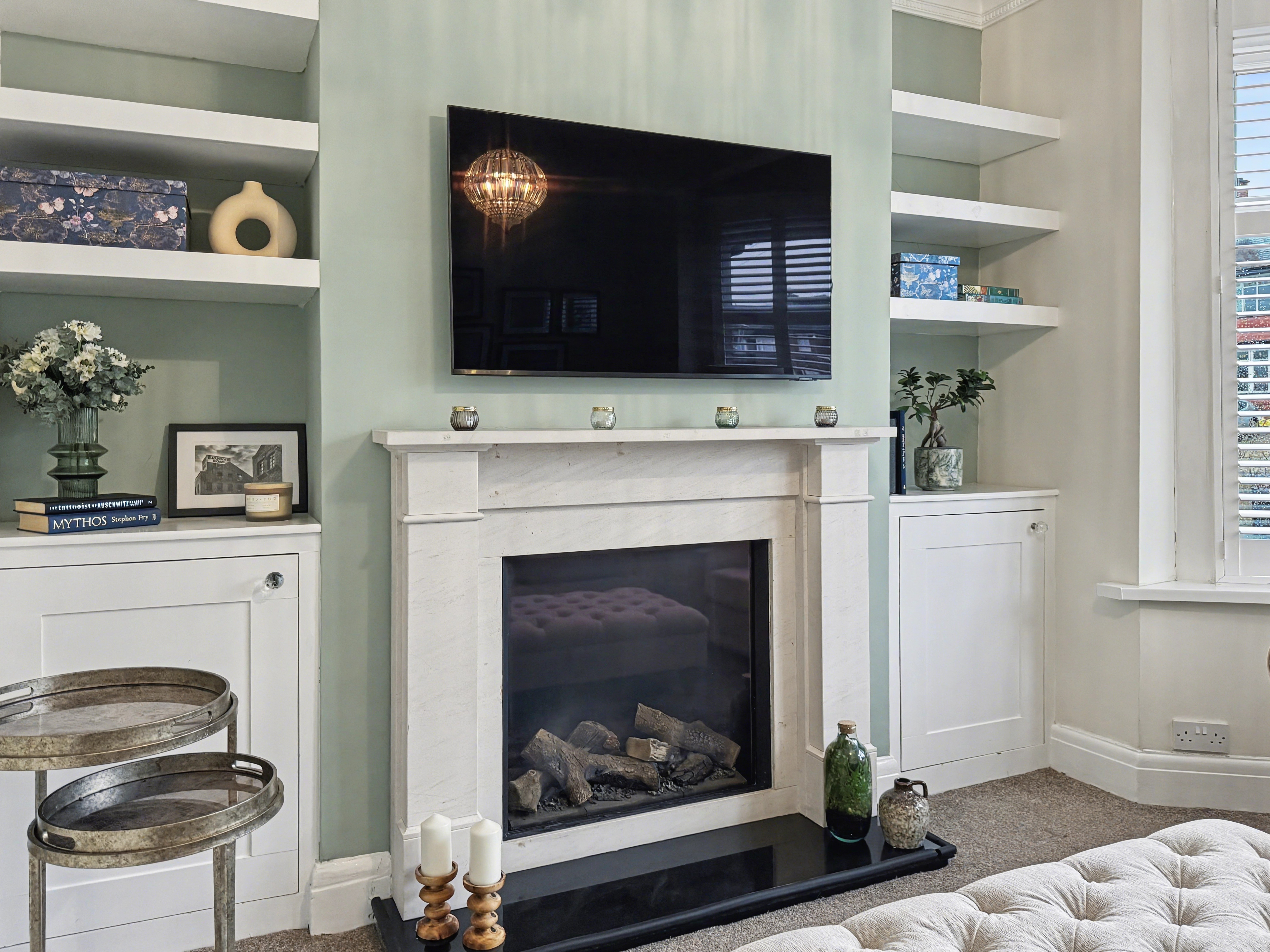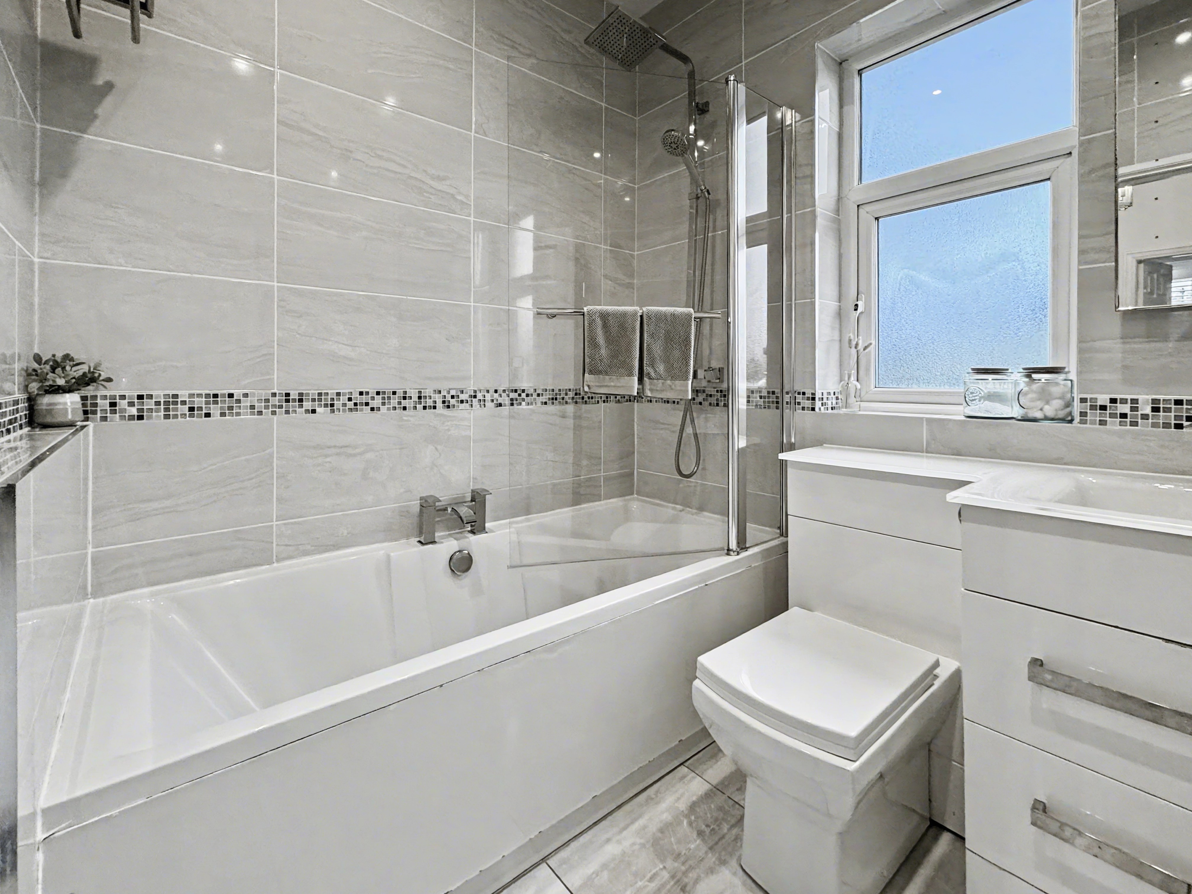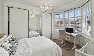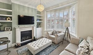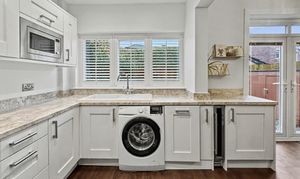 To the first floor are three well-proportioned bedrooms, two of which benefit from professionally fitted wardrobes. The contemporary bathroom is finished with a modern white three-piece suite, incorporating a stylish glass sink set within a practical storage unit.