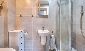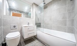 Both bedrooms are generous doubles, ideal for sharers or those who work from home and want the extra space. The master features its own sleek ensuite with a large enclosed shower, WC and basin, finished in contemporary tiling. The main bathroom doesn’t hold back either — complete with a bathtub, overhead shower, hand basin, WC and even a built-in TV so you can soak in the bubbles with a movie.