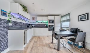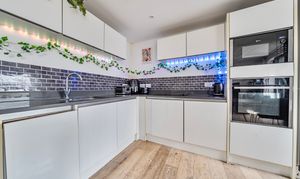 Further along the hallway, there's a third cupboard housing the water tank — neatly tucked away. Then, through to the real star of the show: a bright, open-plan kitchen, living and dining space that’s perfect for relaxing or entertaining. The kitchen is fully fitted with wall and floor units and comes with everything you’d expect from a high-spec apartment — integrated electric oven and microwave, dishwasher, fridge, freezer, wine cooler, and a sleek stainless steel sink and tap. All set against stylish laminate wood-effect flooring that ties the space together beautifully.