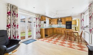 A dual aspect room with windows and doors to the front and rear. Fitted with a range of base and wall units, working surfaces and tiled splash backs. Stainless steel sink, double eye-level oven, four ring gas hob and extractor hood. Space for dishwasher. Radiator. Ceiling fan.