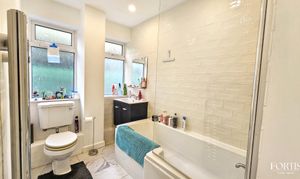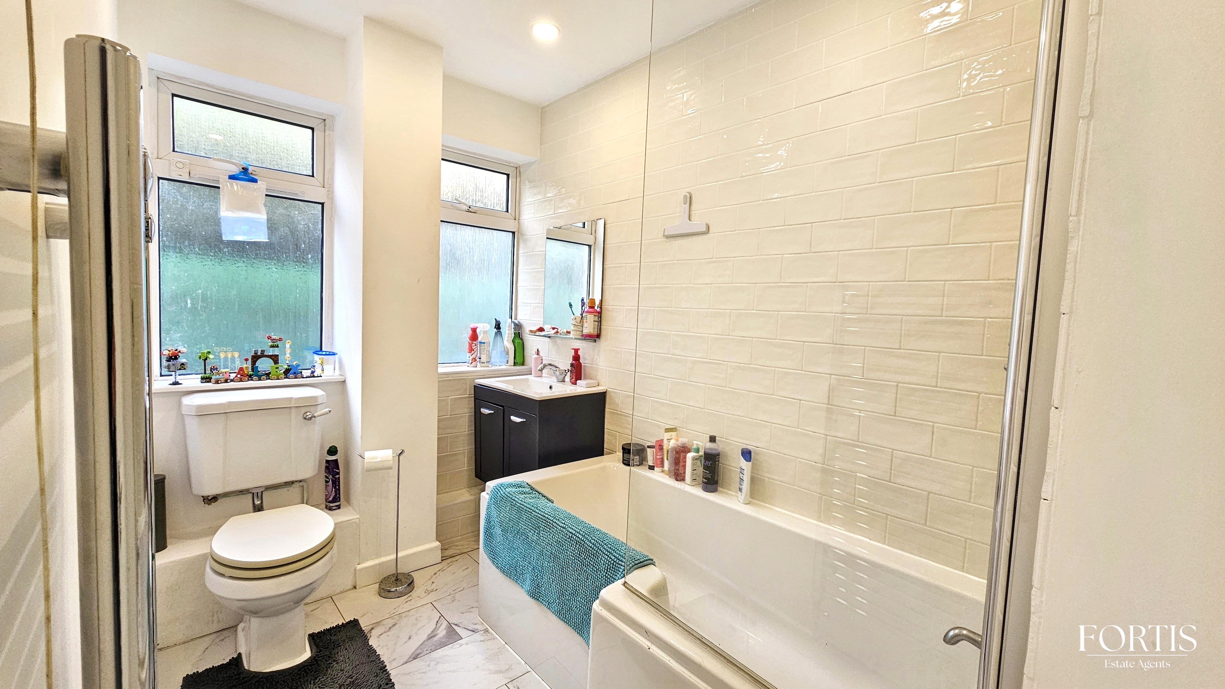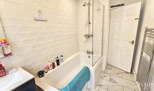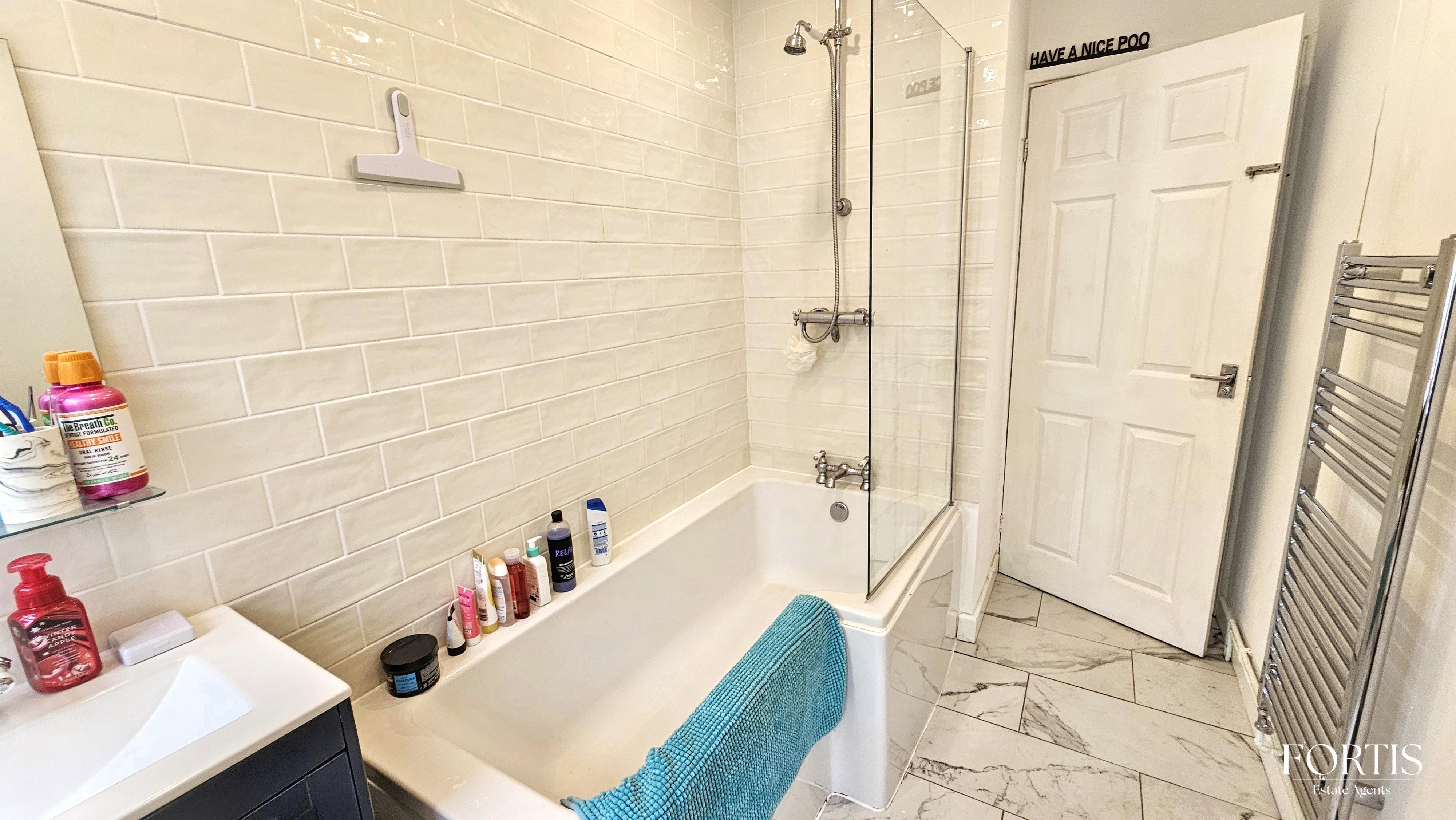 A beautifully appointed bath, fitted with a modern three piece suite comprising panel enclosed bath with tiled surround, and shower over, low level WC, vanity unit with inset sink and storage cupboards beneath, tiled flooring, double glazed rear aspect window x 2, ceiling spot lights, chrome effect heated towel rail.