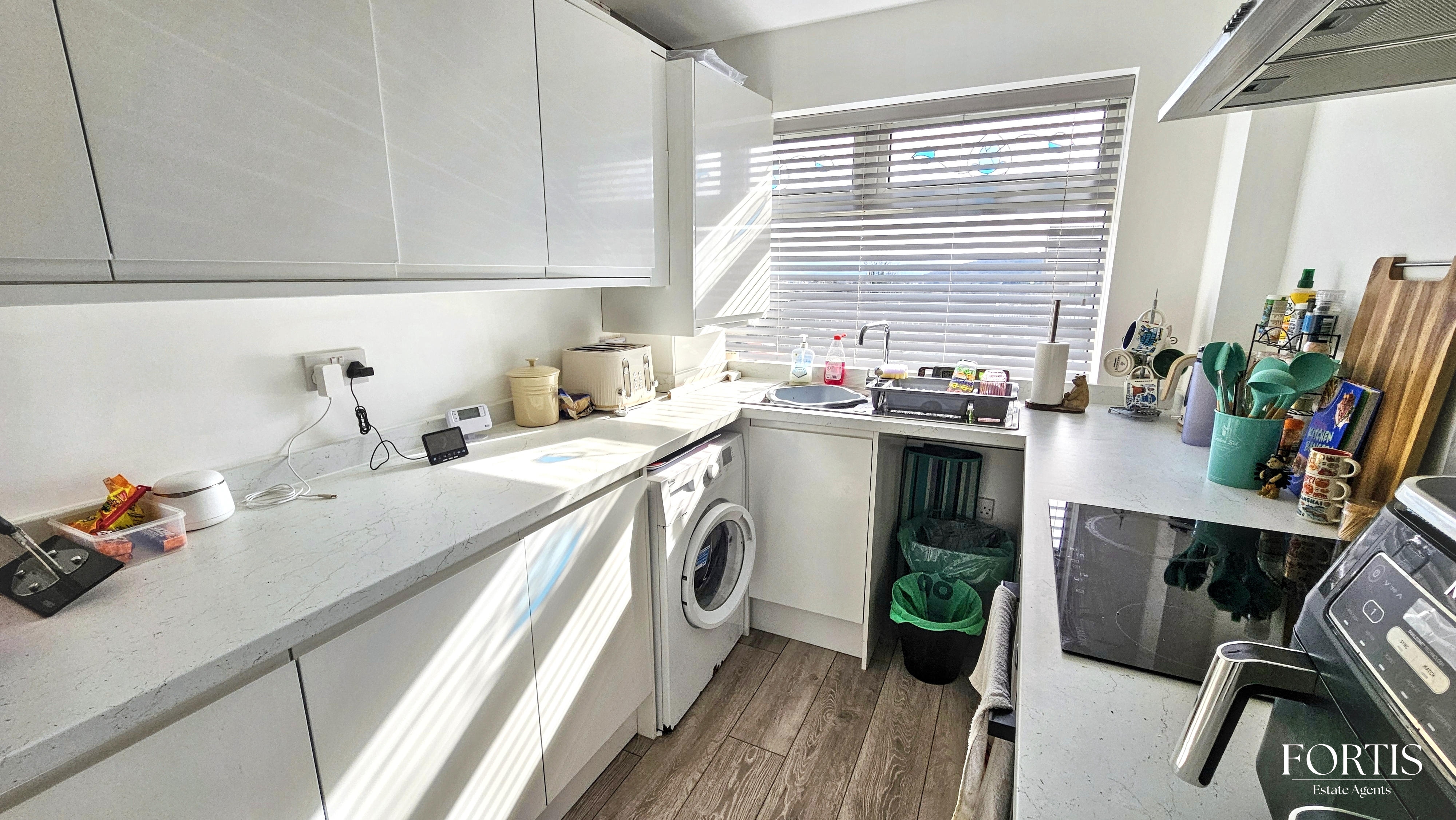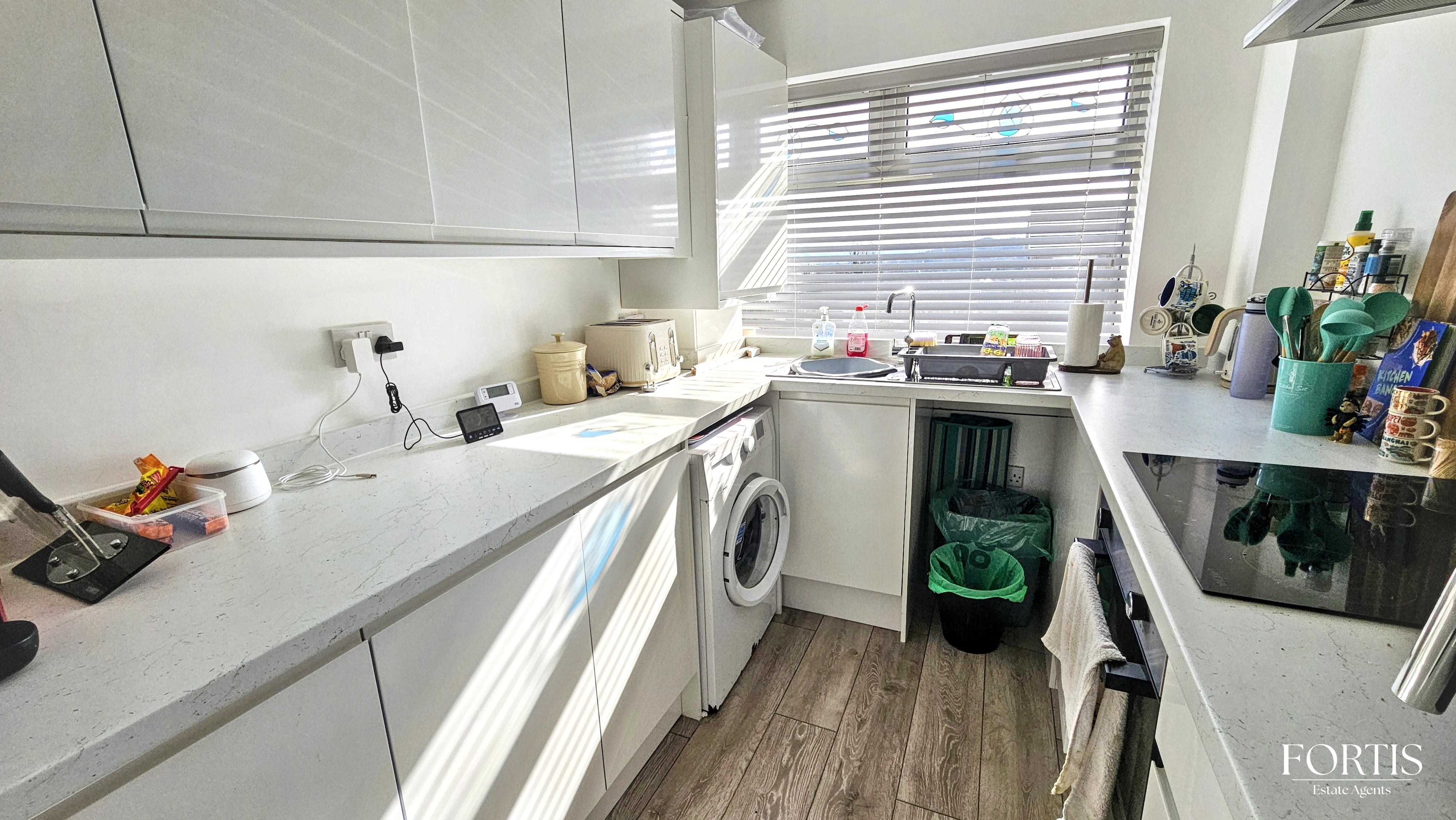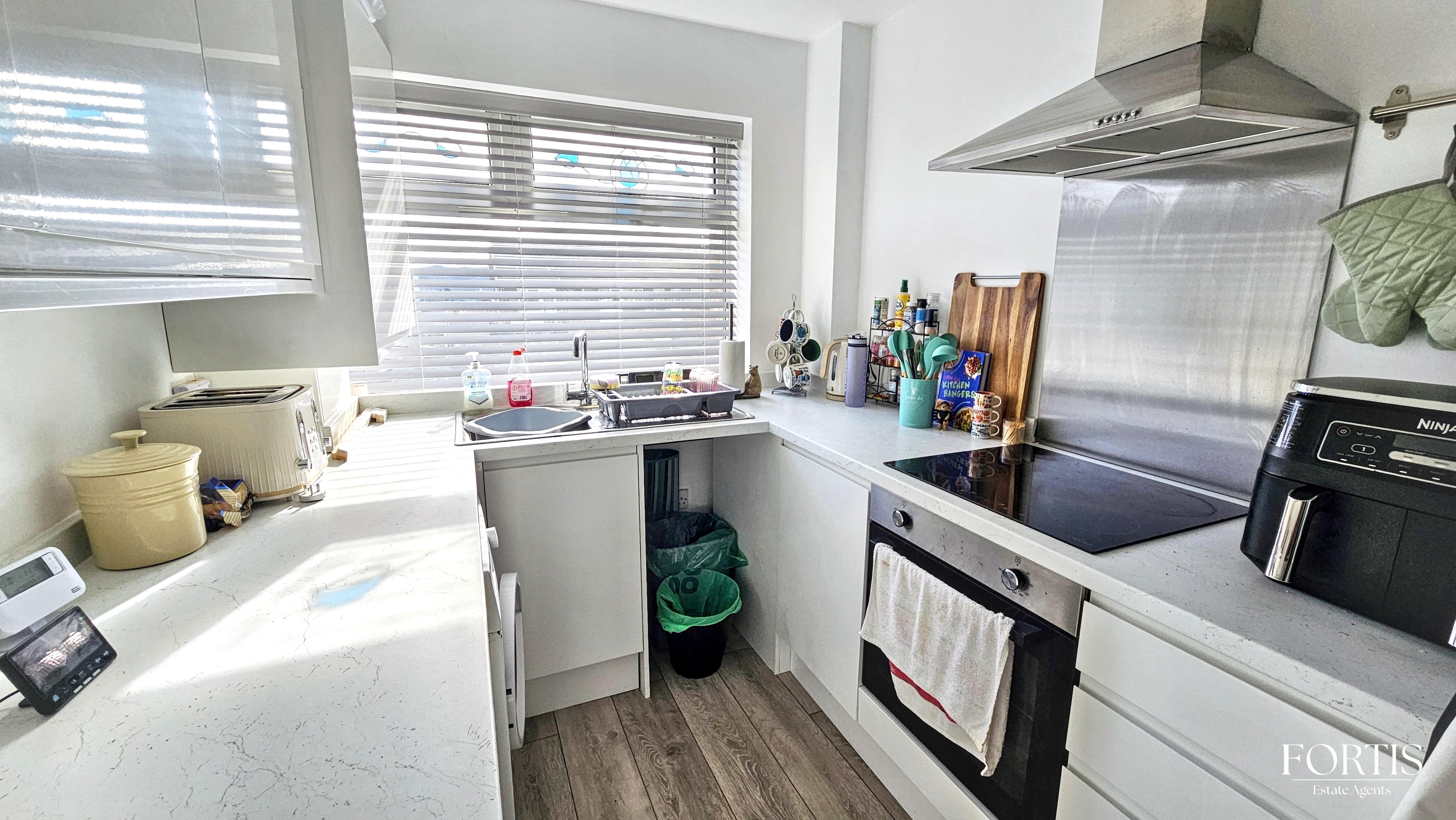A beautifully appointed kitchen, fitted with a matching range of wall and bae level cupboard and drawer units with work surfaces over, inset sink and drainer with mixer tap, integrated electric oven and hob, cooker hood above, space for appliances, double glazed window to the front.