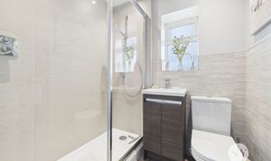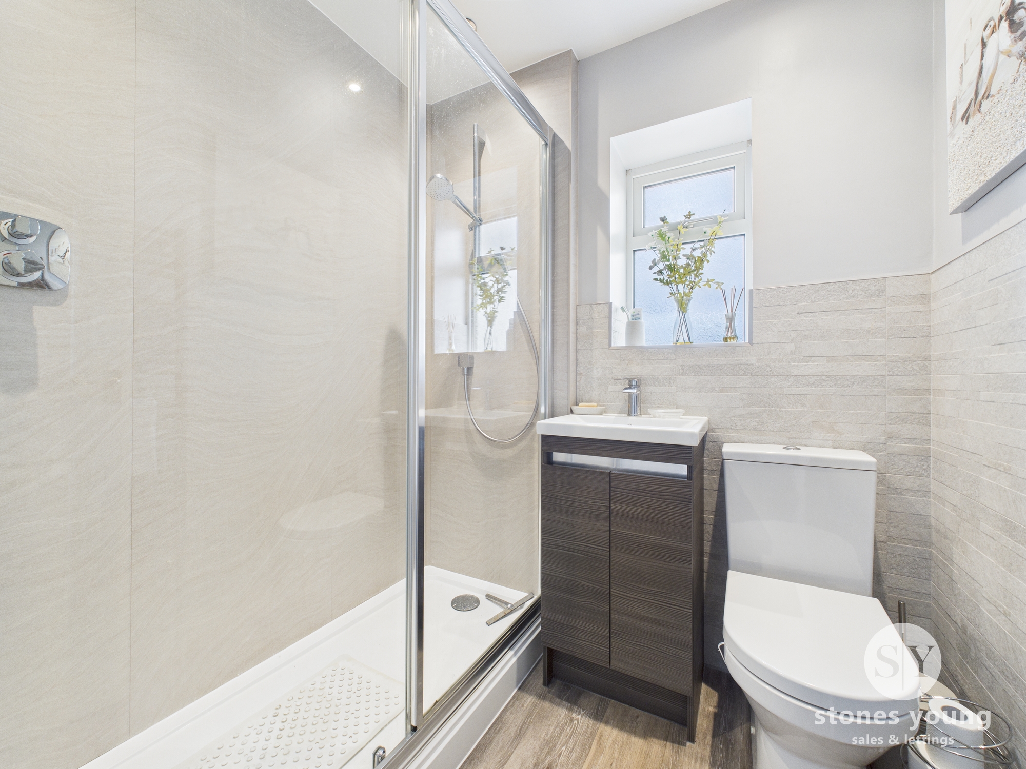 Three piece suite with shower enclosure, Wc and vanity unit housing sink, heated towel rail, vinyl flooring, upvc double glazed frosted window