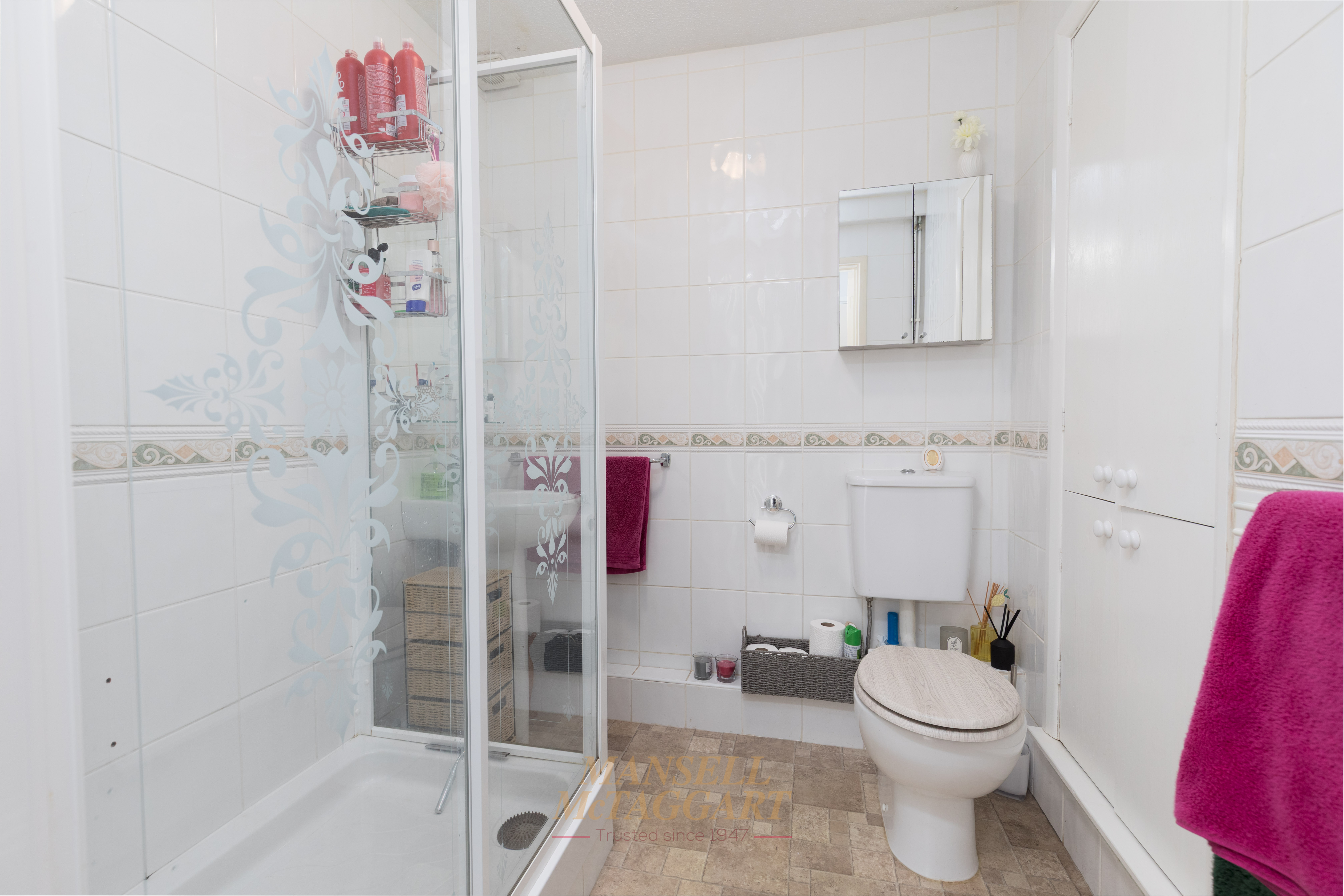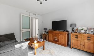 Positioned to the rear of the property, the living room is a generous and inviting space. Recently redecorated with fresh paintwork and new carpeting, it provides a comfortable setting for relaxing or entertaining. A large patio door not only floods the room with natural light but also opens directly onto the beautifully maintained south-facing communal garden. This seamless flow between indoor and outdoor living is perfect for summer evenings or weekend gatherings, while the room itself can easily accommodate sofas, armchairs, and additional freestanding furniture.