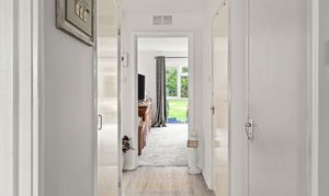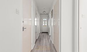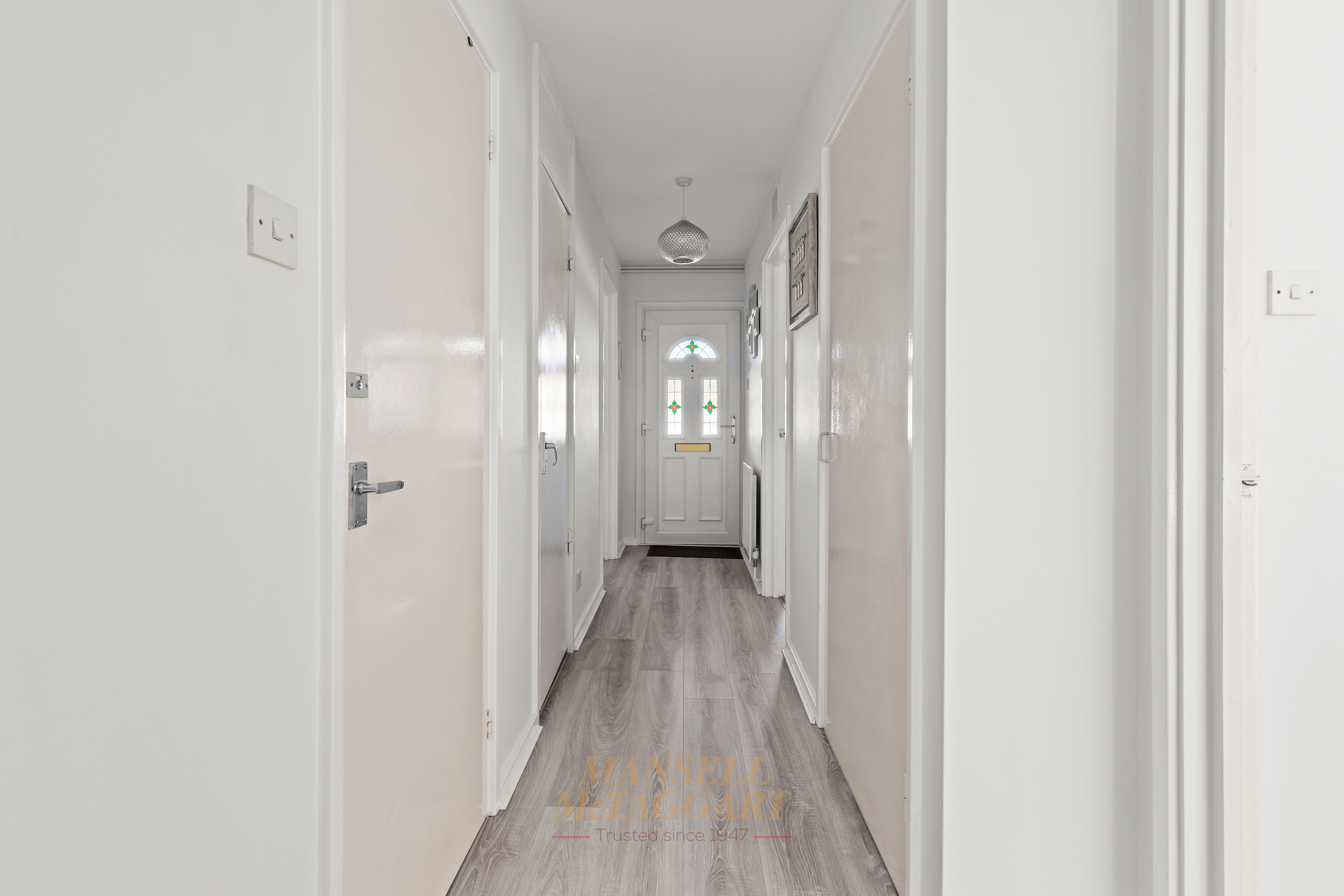 The property is approached via a pretty footpath flanked by well-maintained lawns, mature plants, and colourful flowerbeds, creating an immediate sense of welcome. On entering, you are greeted by a spacious hallway finished with engineered wooden flooring, offering plenty of room for coats, shoes, and daily essentials. Two deep built-in storage cupboards add practicality and convenience, ideal for household items or additional wardrobe space.