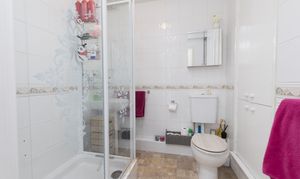 The shower room has been fitted with modern fixtures, including a walk-in shower cubicle, pedestal wash hand basin, and low-level WC. Recessed spotlights provide a clean, contemporary finish, while part-tiled walls add practicality and style.