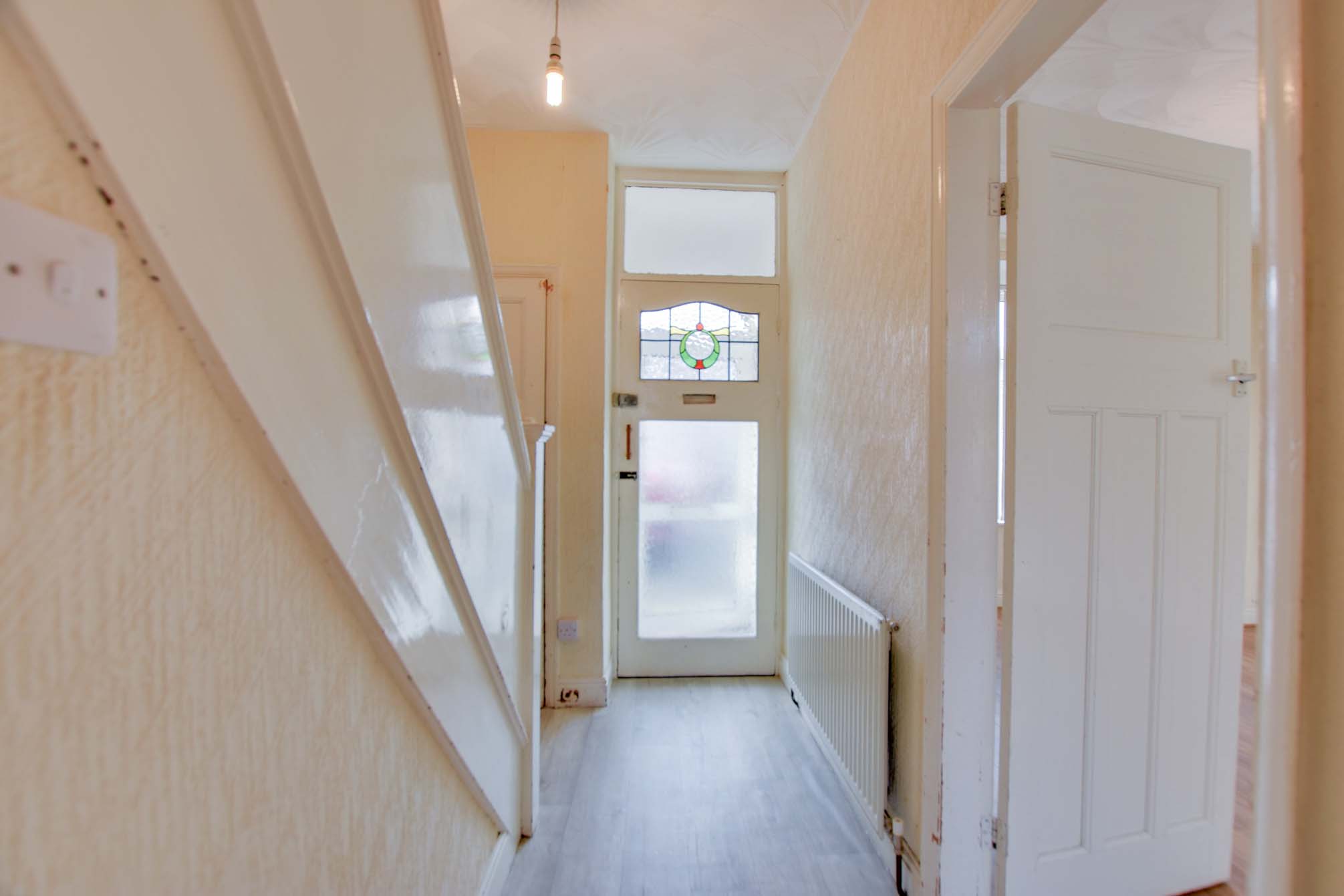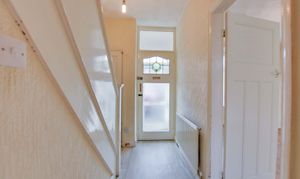 Features an internal door leading to the entrance hall, stairs to the first floor, a storage cupboard, lino flooring, and a radiator.