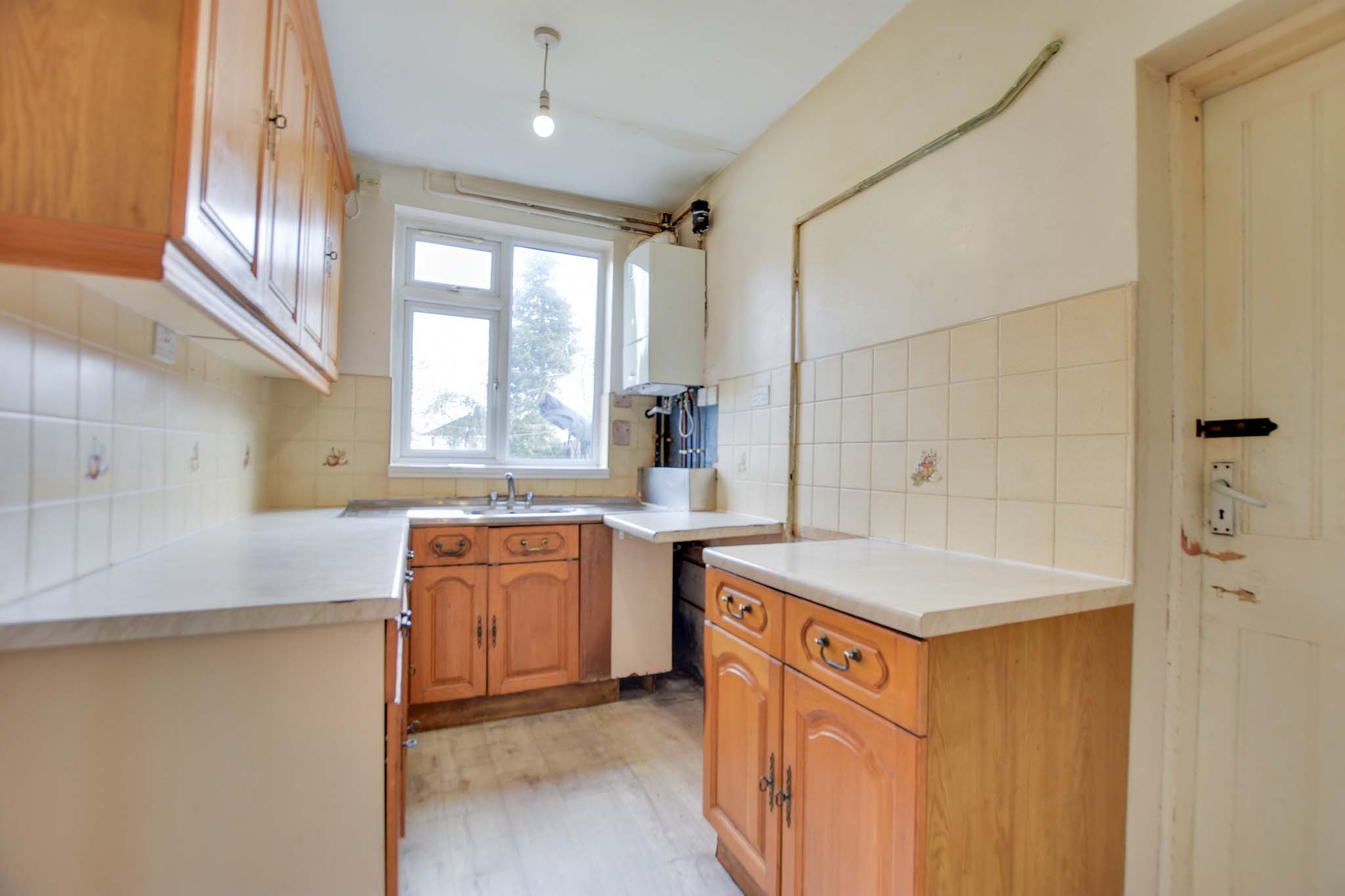 The kitchen is fitted with a range of wall and base units, a stainless steel sink and drainer, gas cooker point, plumbing for a washing machine, and a wall-mounted boiler. A side lobby provides additional front and rear access.