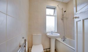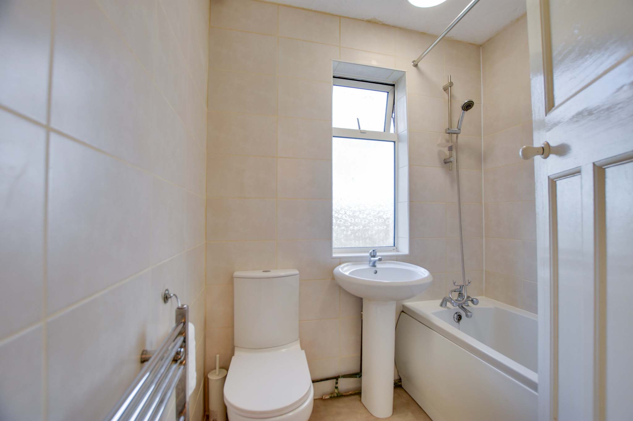 Comprises a bath with mixer tap/shower attachment, low-level WC, pedestal wash hand basin, tiled walls, and a heated chrome towel rail.