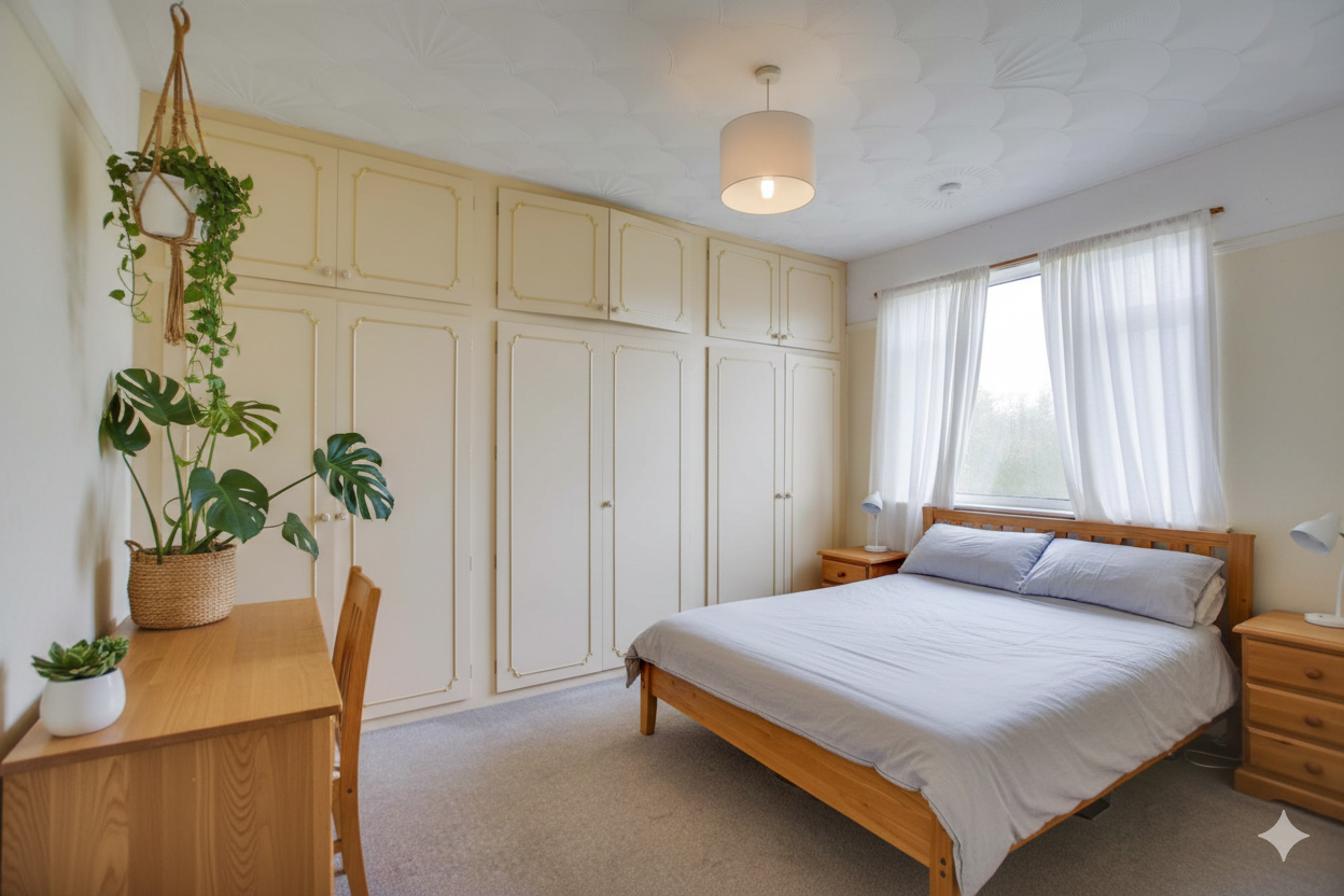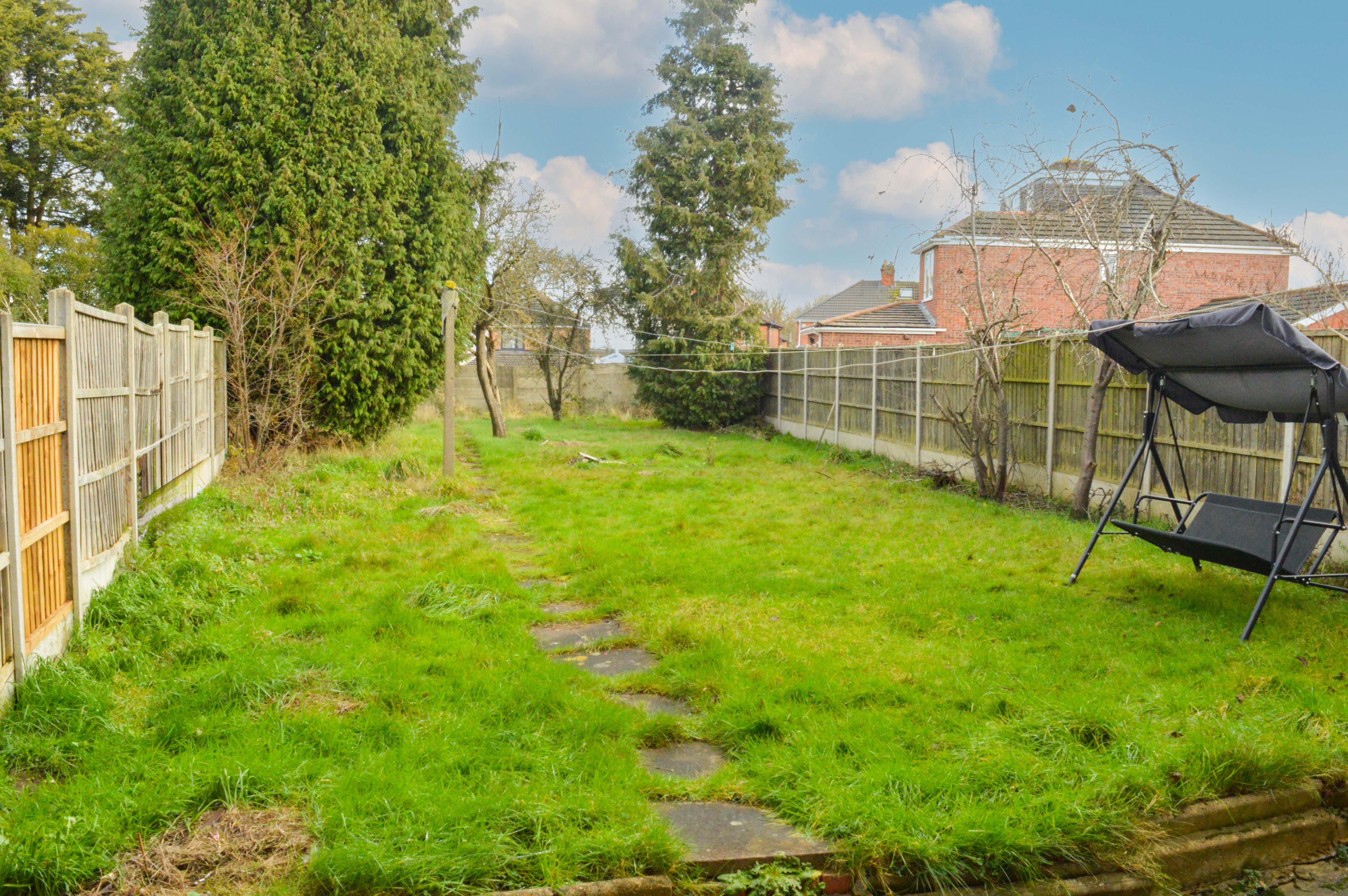 Outside, the rear garden includes a patio area leading to a large, mainly lawned garden with mature trees and fenced boundaries. To the front, there is a paved driveway providing off-road parking for one car, alongside a lawned area.