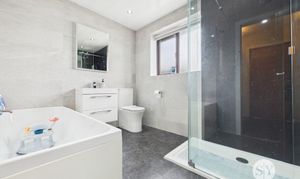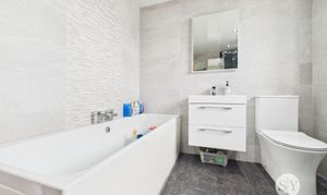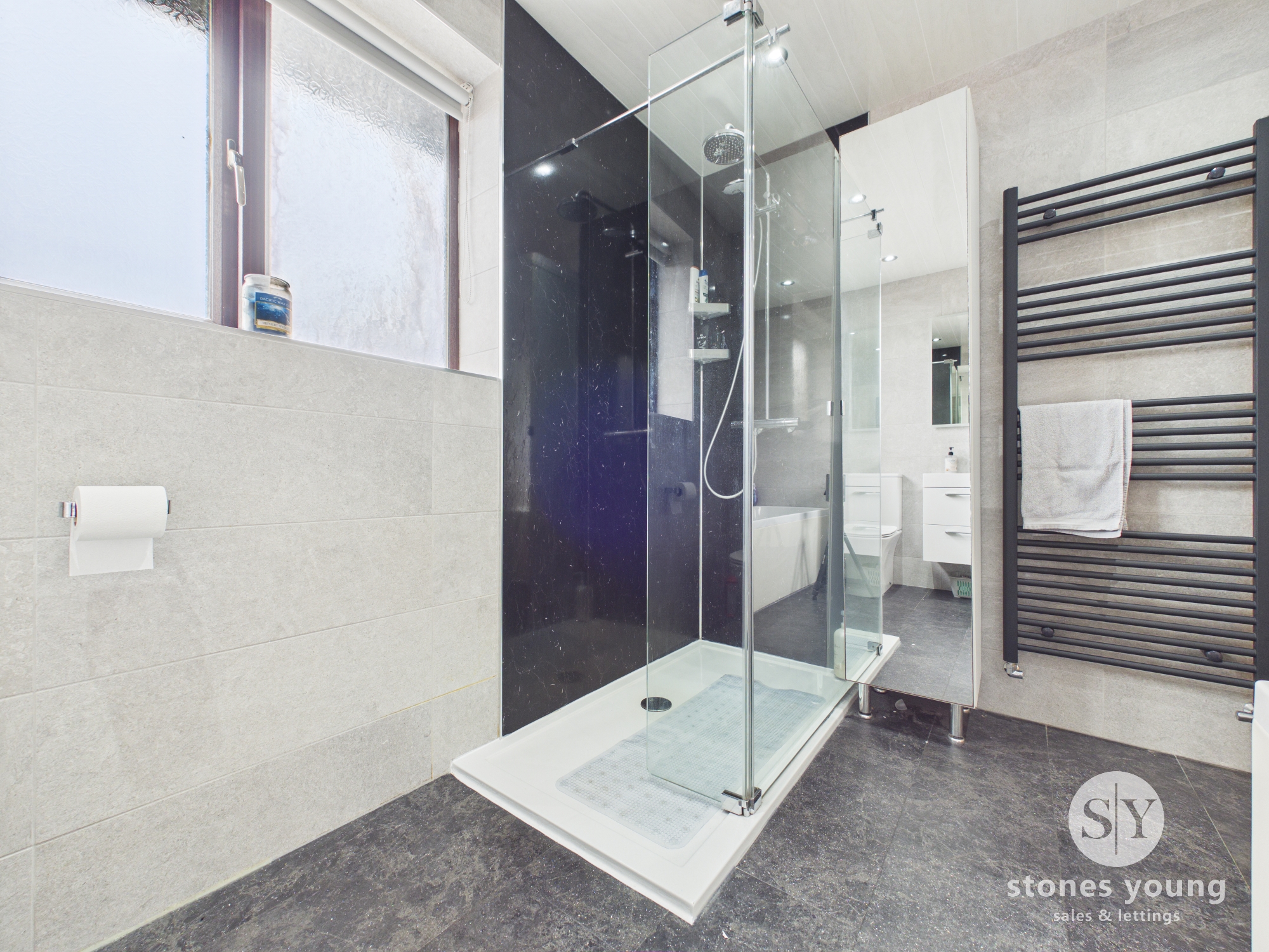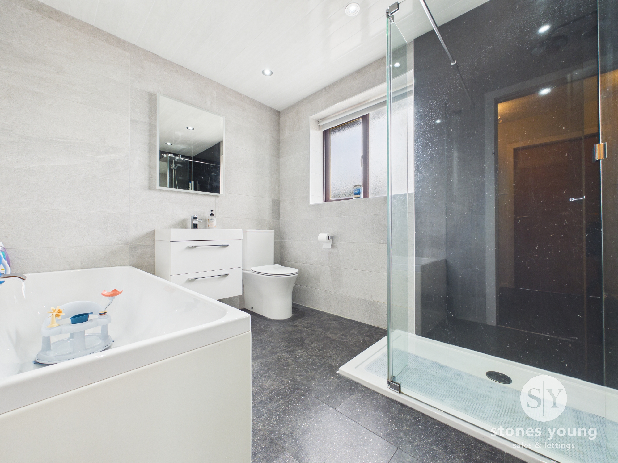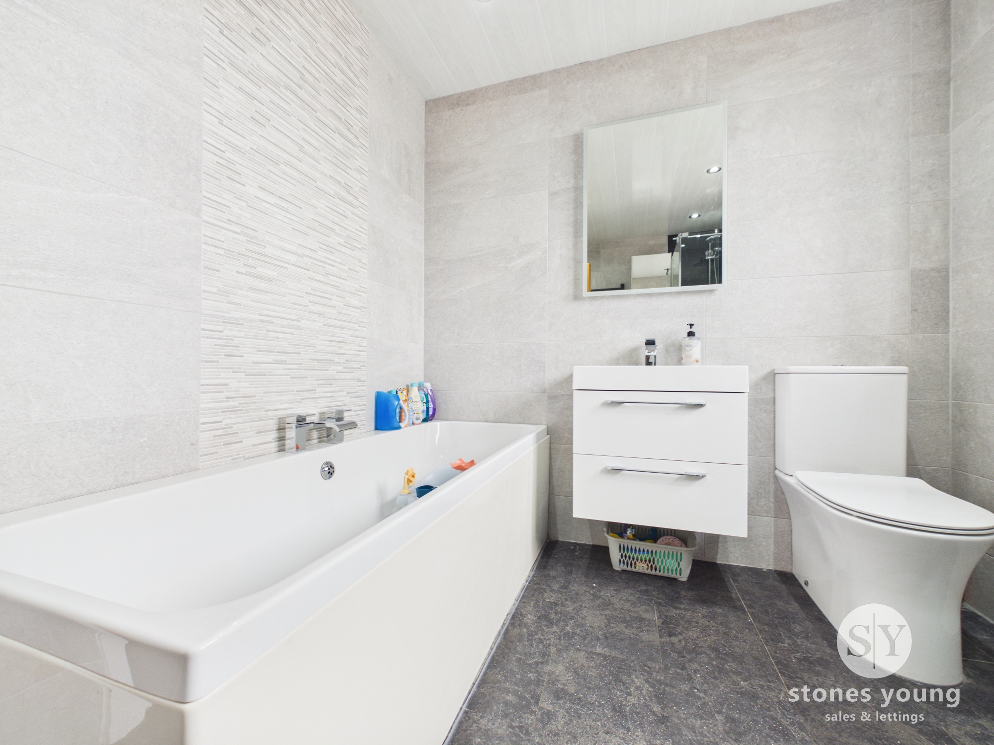 Tiled floor, floor to ceiling tiles, four piece suite in white comprising of bath tub, shower enclosure with mains fed shower, wc and basin, towel radiator, upvc double glazed frosted window, towel radiator