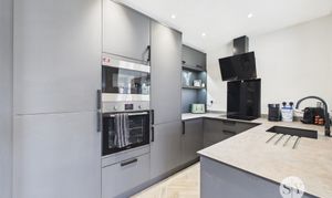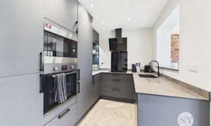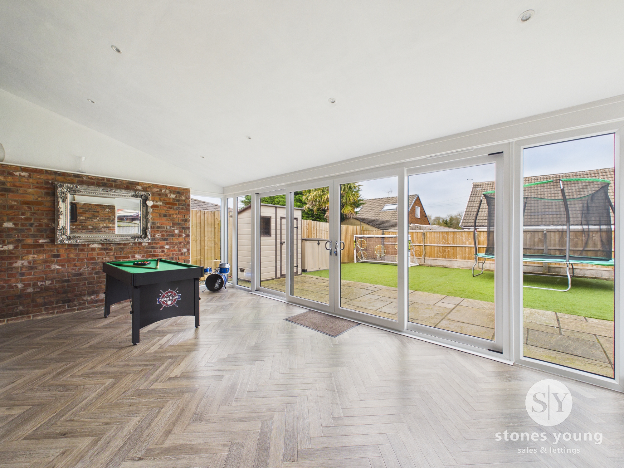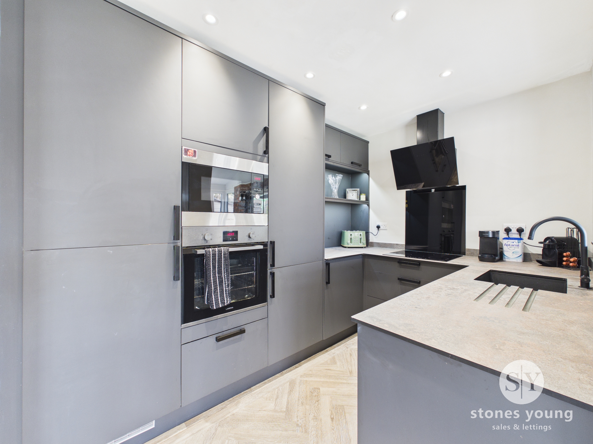 Lvt flooring, panel radiator x2, fitted base and wall units with contrasting worktops, integrated electric hob, extractor fan, integrated microwave, oven, fridge freezer, dishwasher, upvc double glazed windows and sliding doors, ceiling spotlights