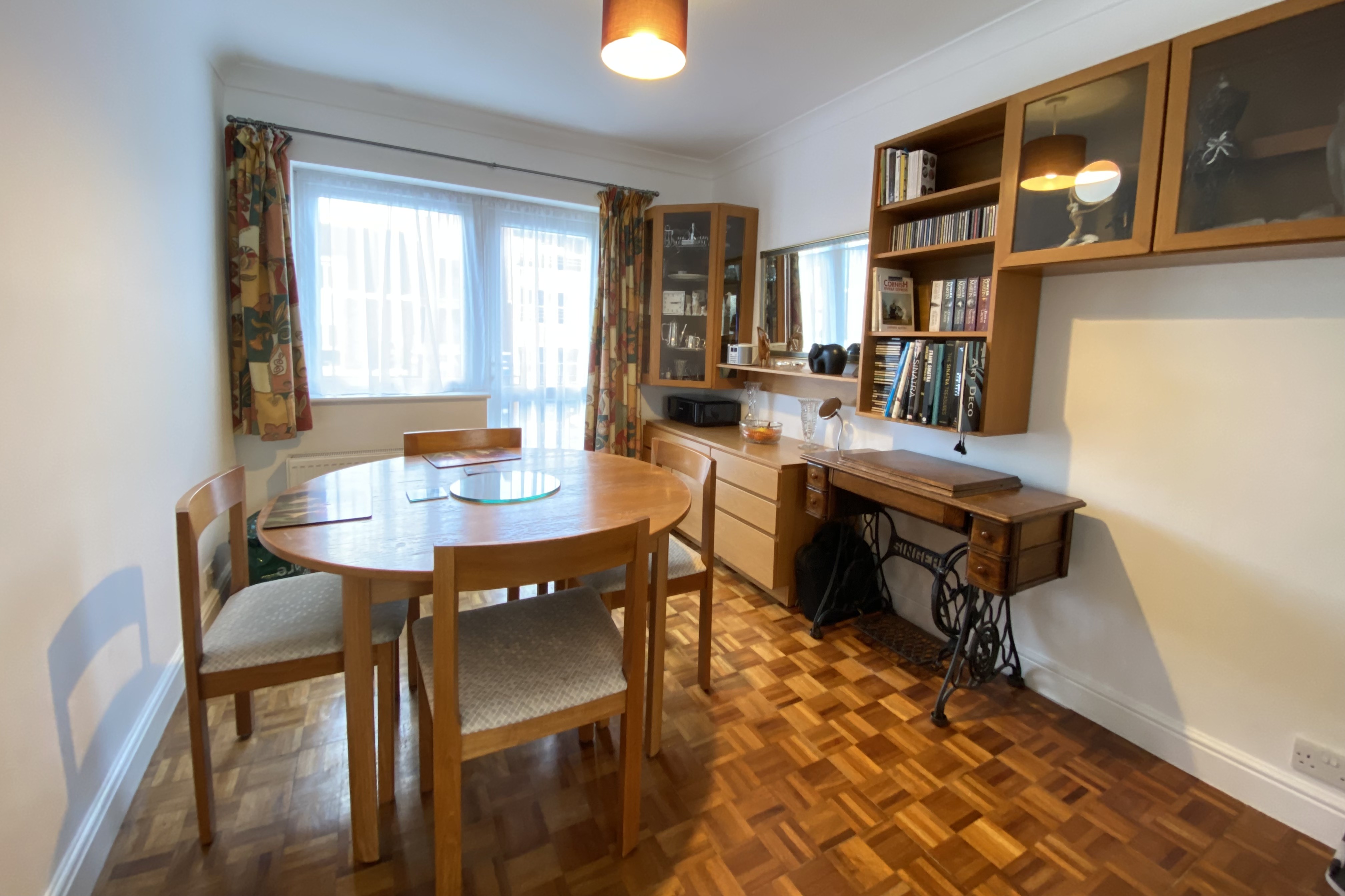 The property is accessed via communal stairs behind Gail’s Bakery, into a light hallway with bespoke oak fitted cupboards under the stairs. To the right is the main living area which is a wide, dual aspect living and dining room. It features the original block wooden floor and has direct access to the private balcony.