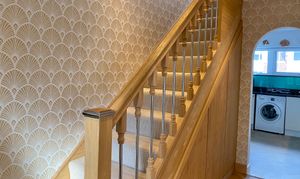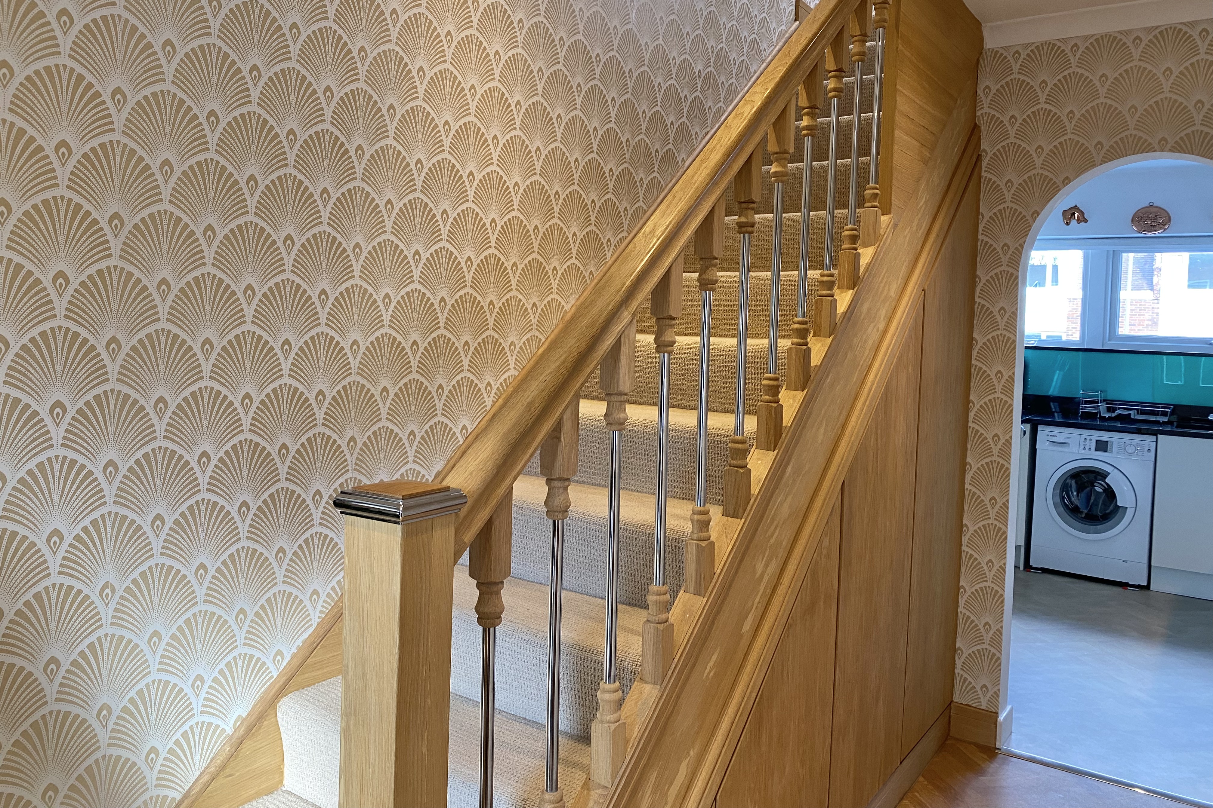 The open staircase leads up to a good-sized family bathroom, three bedrooms, and further bespoke storage cupboard.