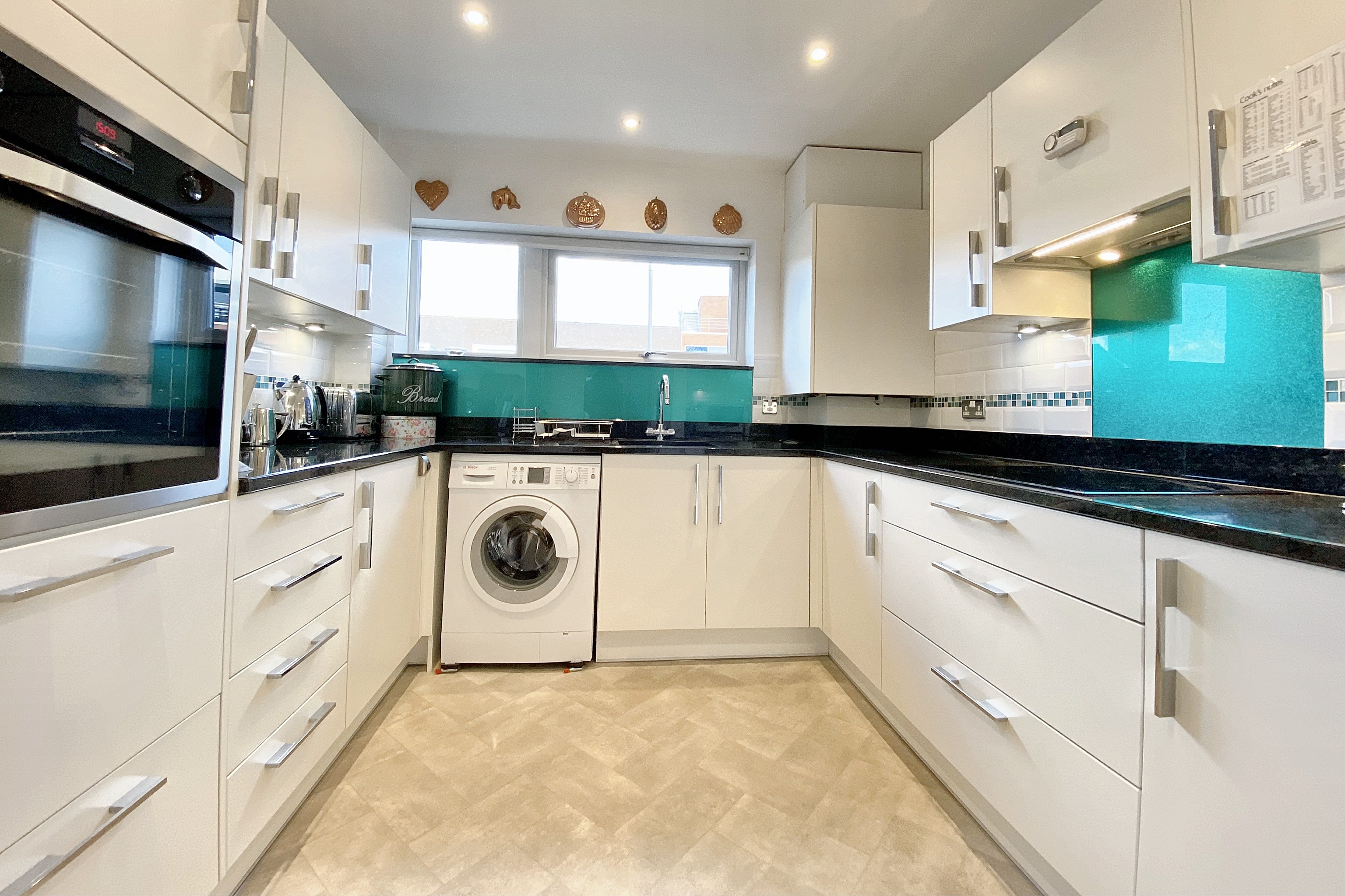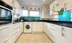 At the far end of the hallway is access to the well-appointed John Lewis kitchen, with built in electric oven, induction hob, extractor fan and washing machine. The door finish is contemporary grey, with a granite work surface, wall-tiling, and glass splashback.