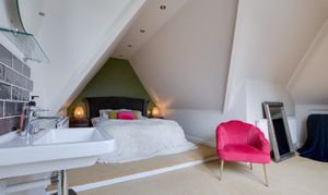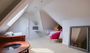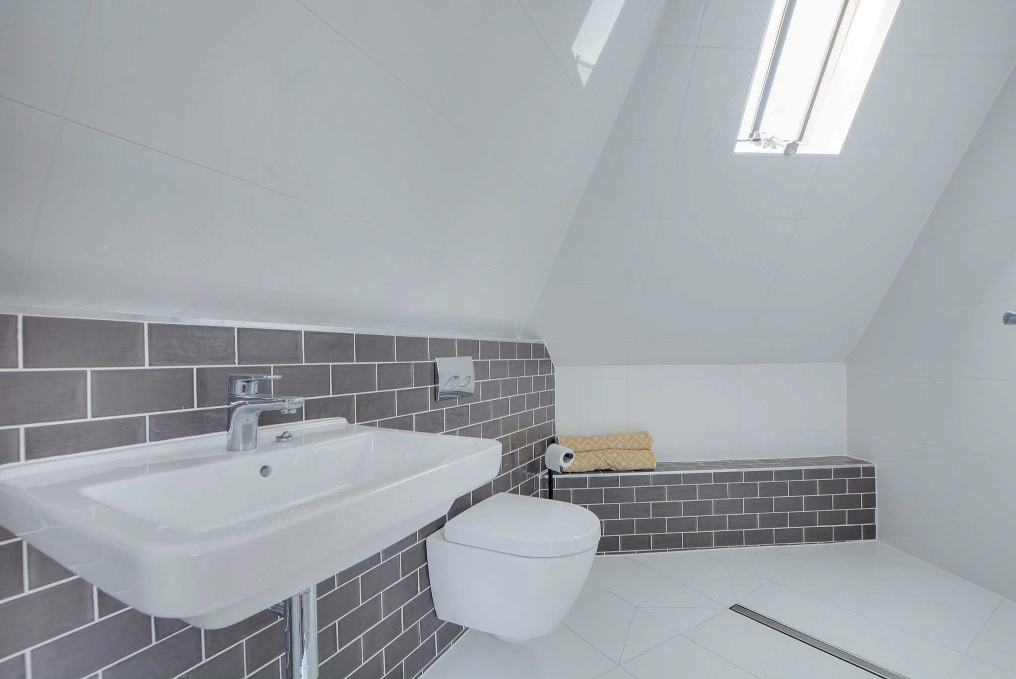 Measurement plus recess. With skylight windows to the rear elevation, under eaves storage, spotlights, wash hand basin with tiled splashback, radiator.