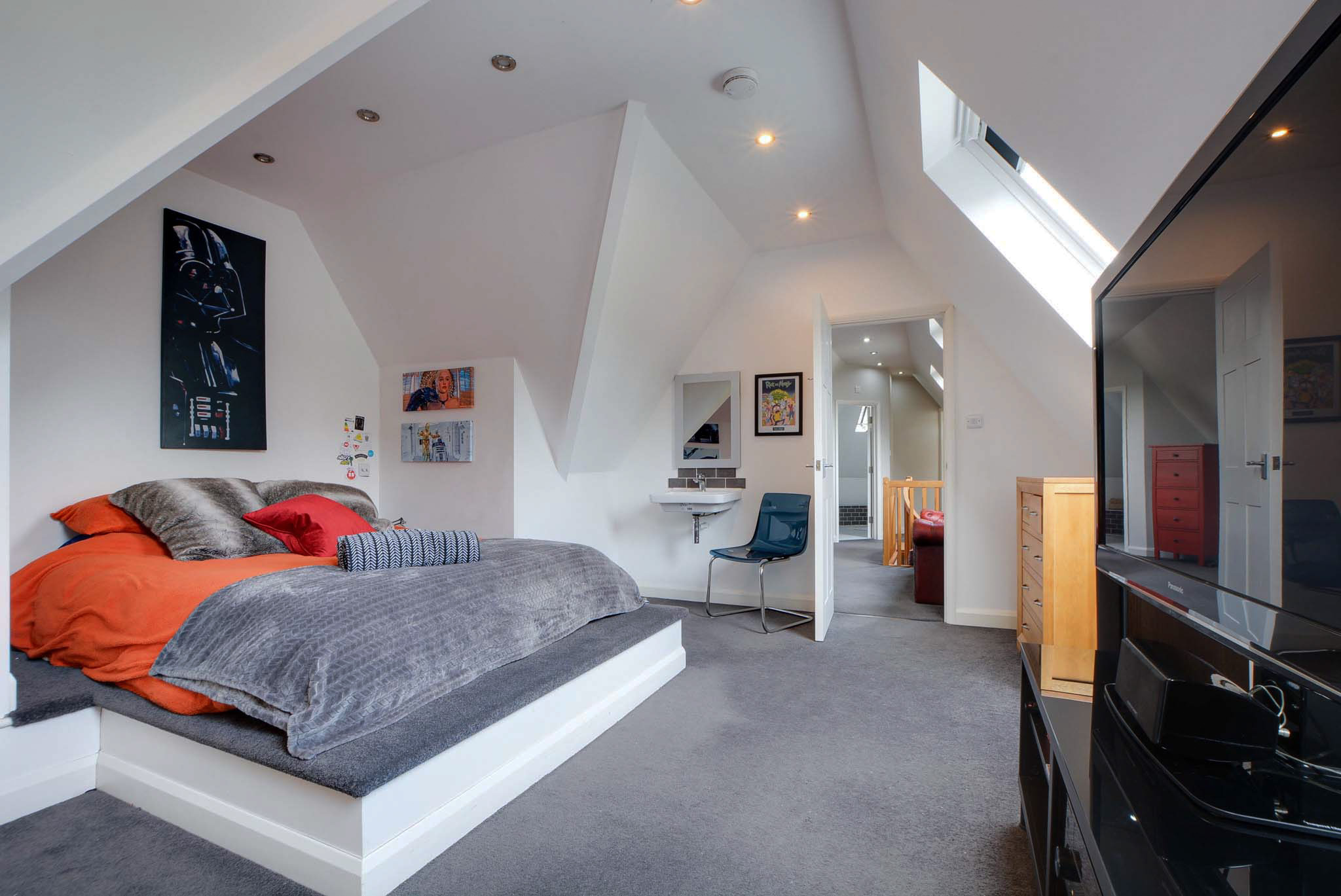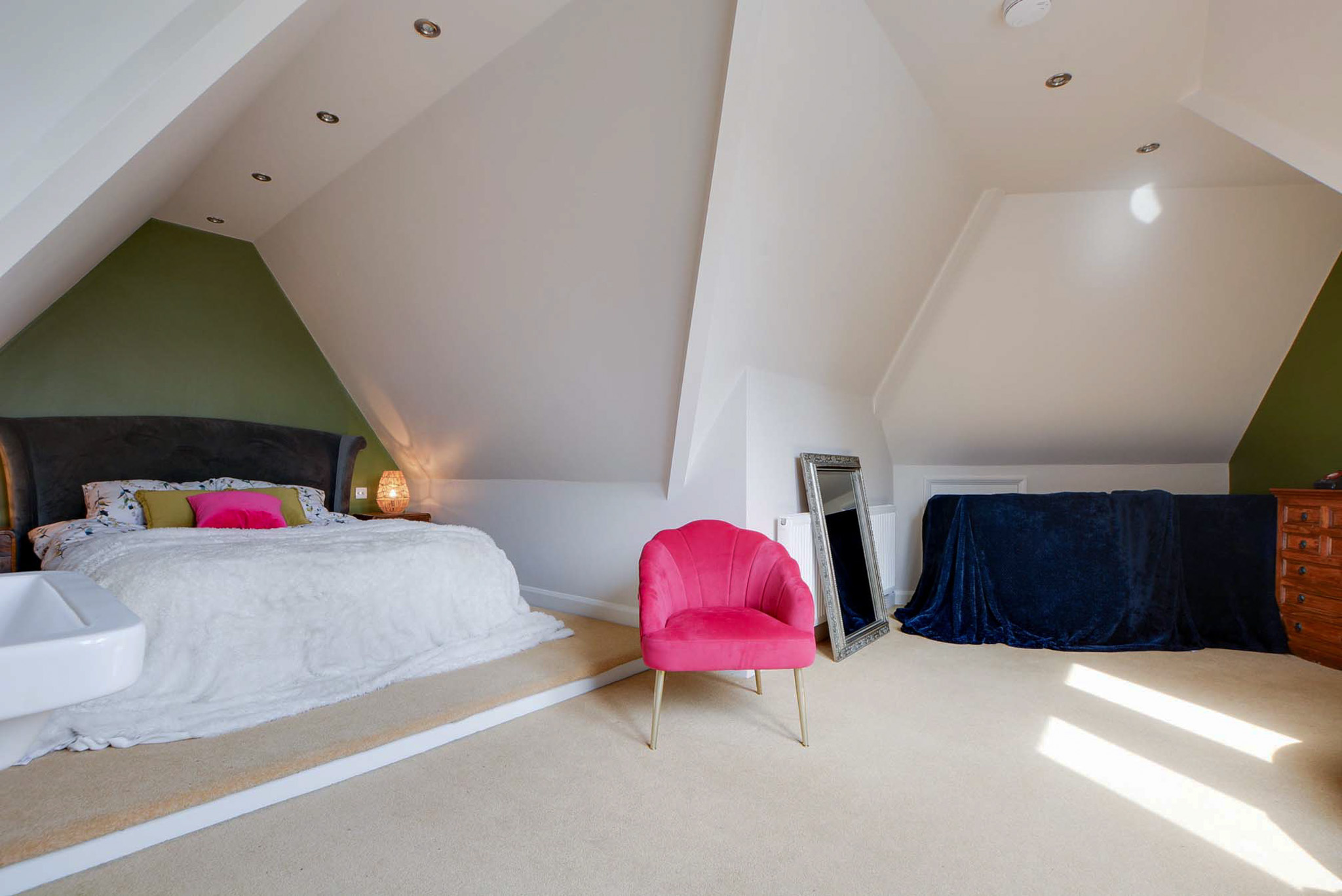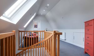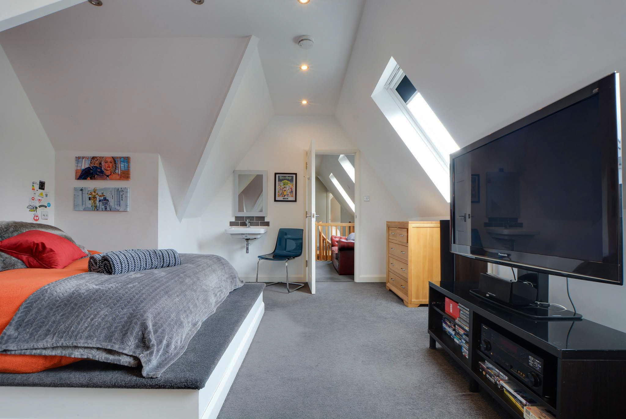 With two skylight windows to the rear elevation, spotlights, under eaves storage, radiator.