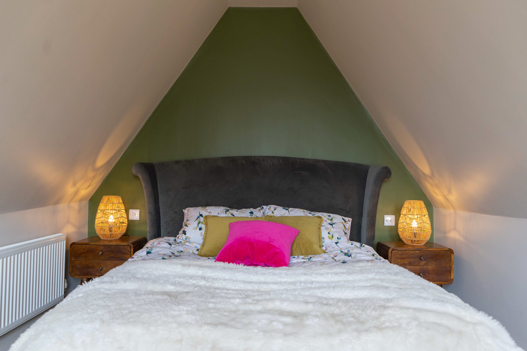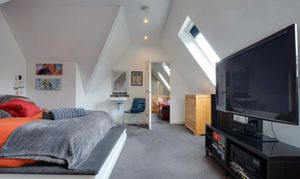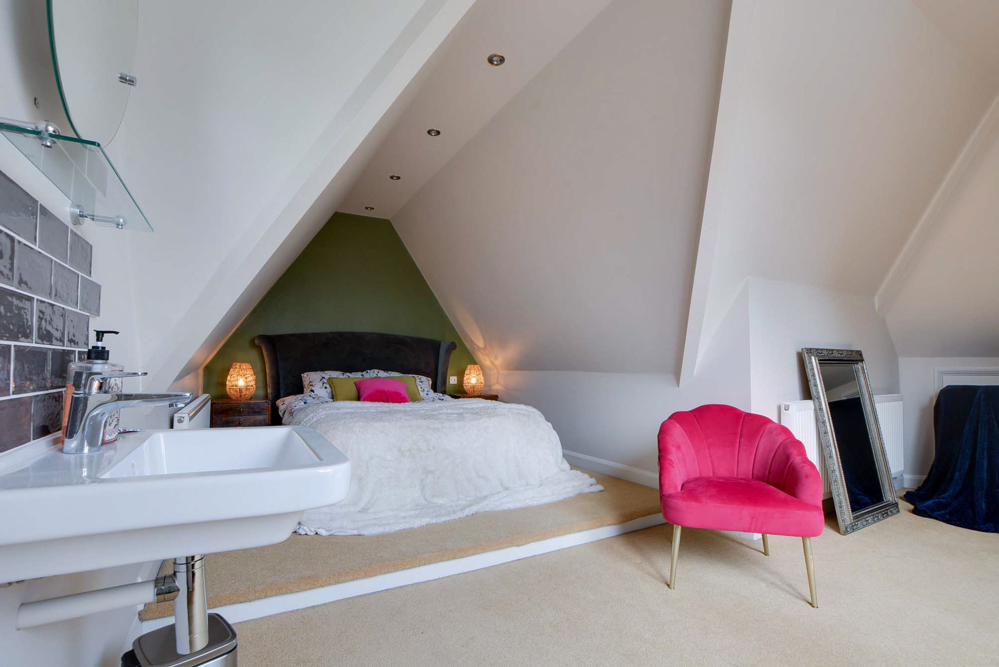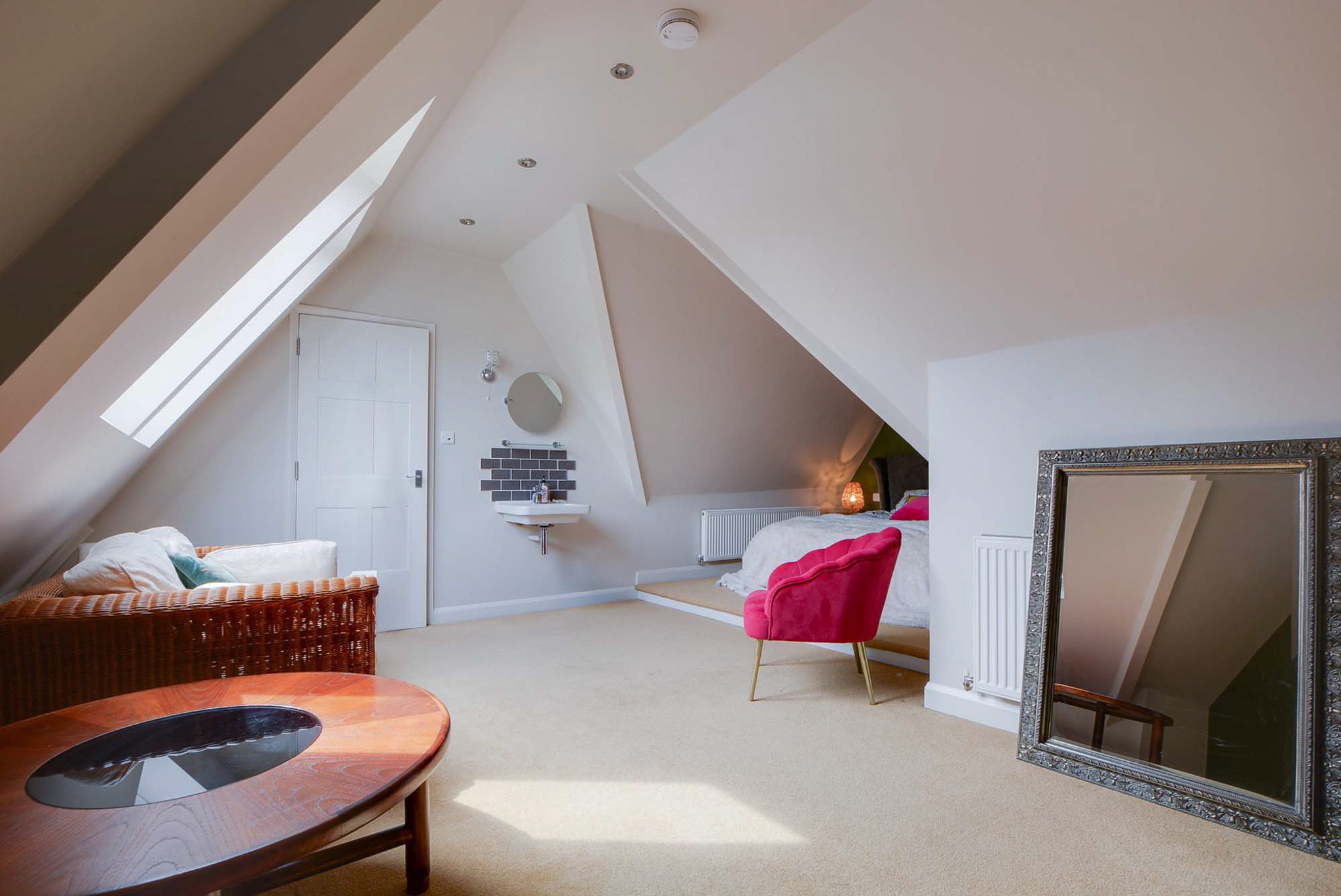With two skylight windows to the rear elevation, spotlights, under eaves storage, radiator.