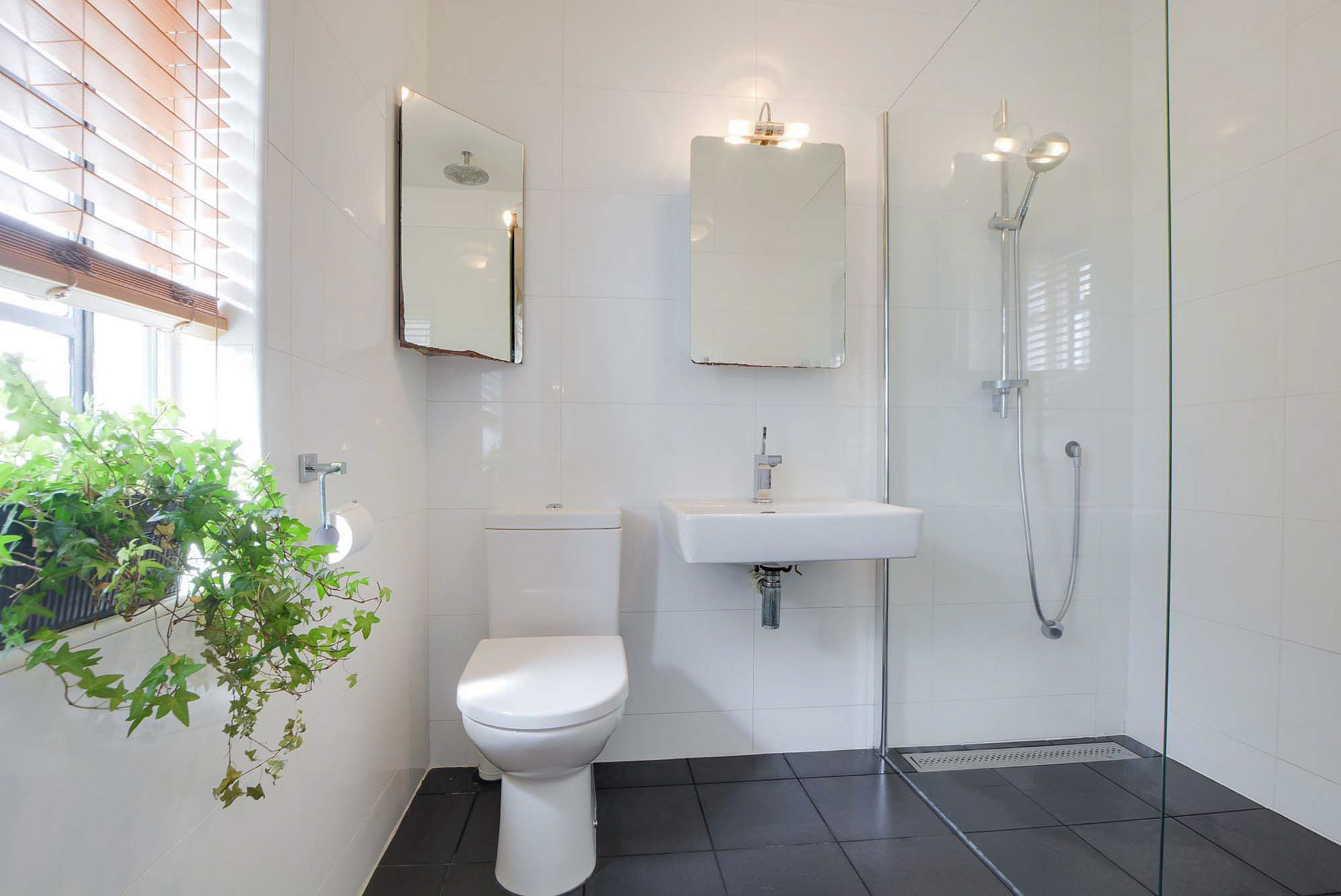 With window to the front elevation, ceramic tiled floor, shower with shower screen, low-level WC, wash hand basin, tiled walls, chrome ladder style towel rail/radiator.