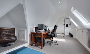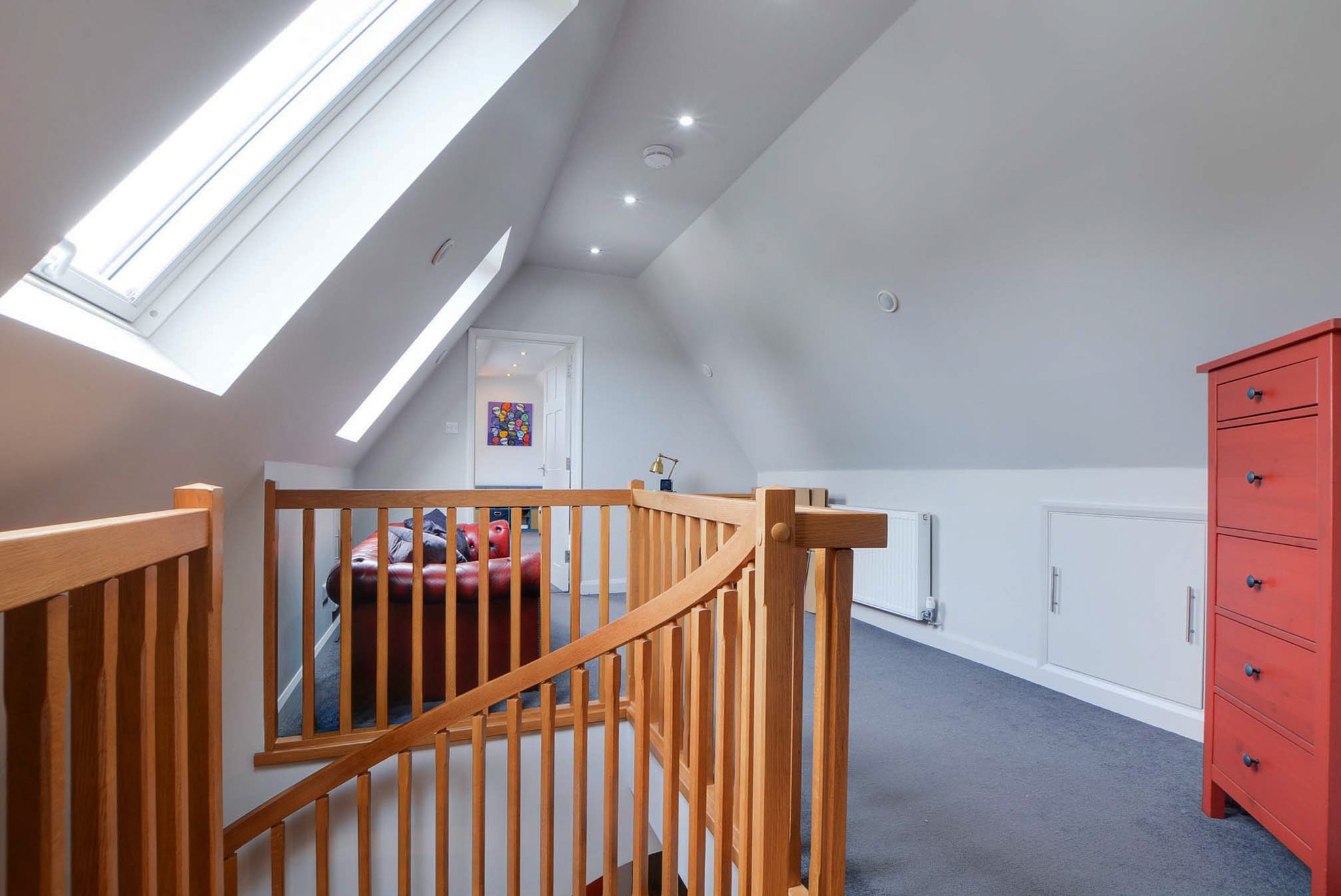 With skylight windows to the rear elevation, built-in cupboard, under eaves storage, spotlights, stairs to first floor, radiator.