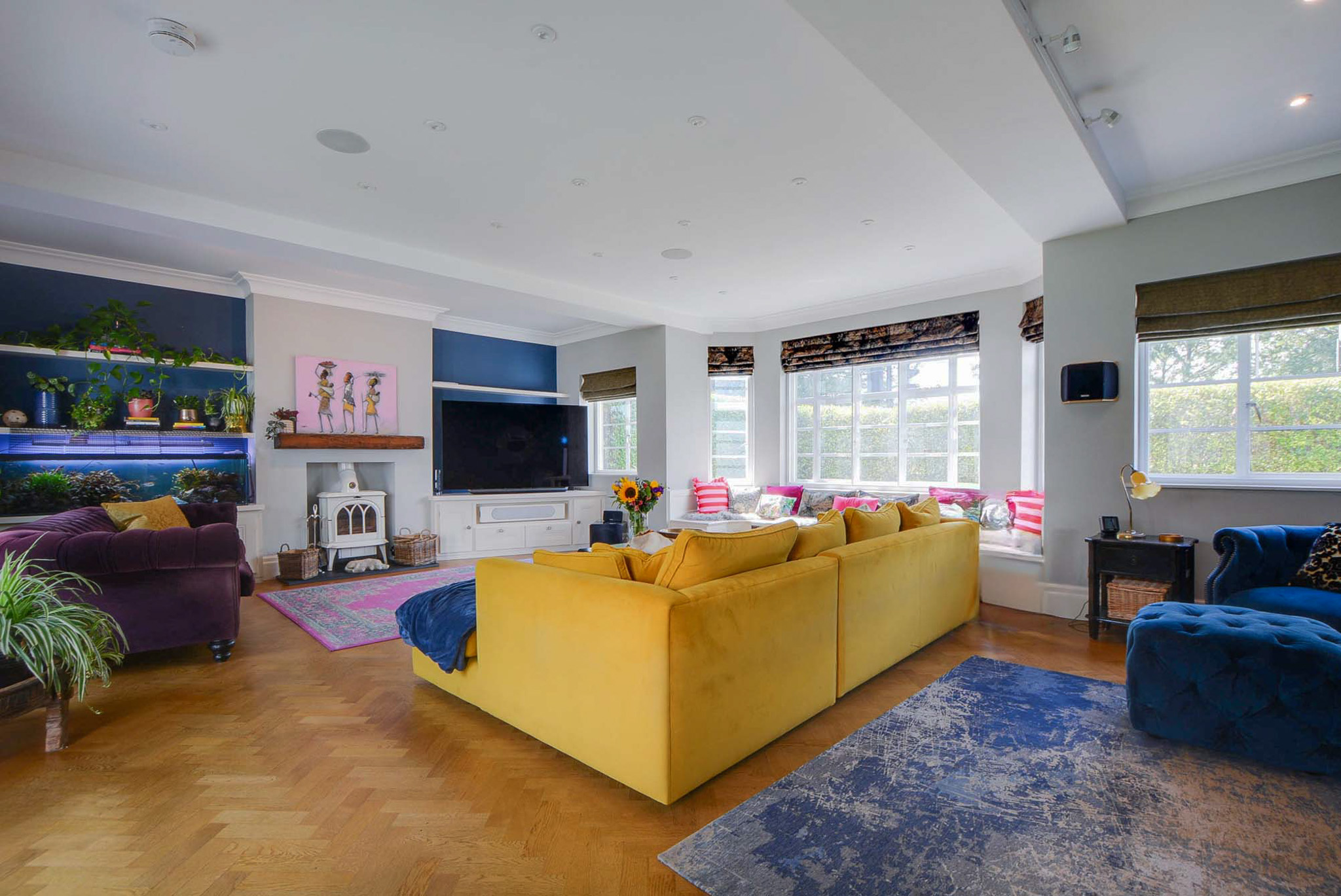 Maximum measurement. With windows to the front and rear elevations, bi-folding doors to the rear garden, parquet herringbone floor, chimney breast with log burning stone and hearth, ceiling coving, spotlights, TV point, two cast iron radiators.