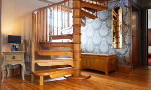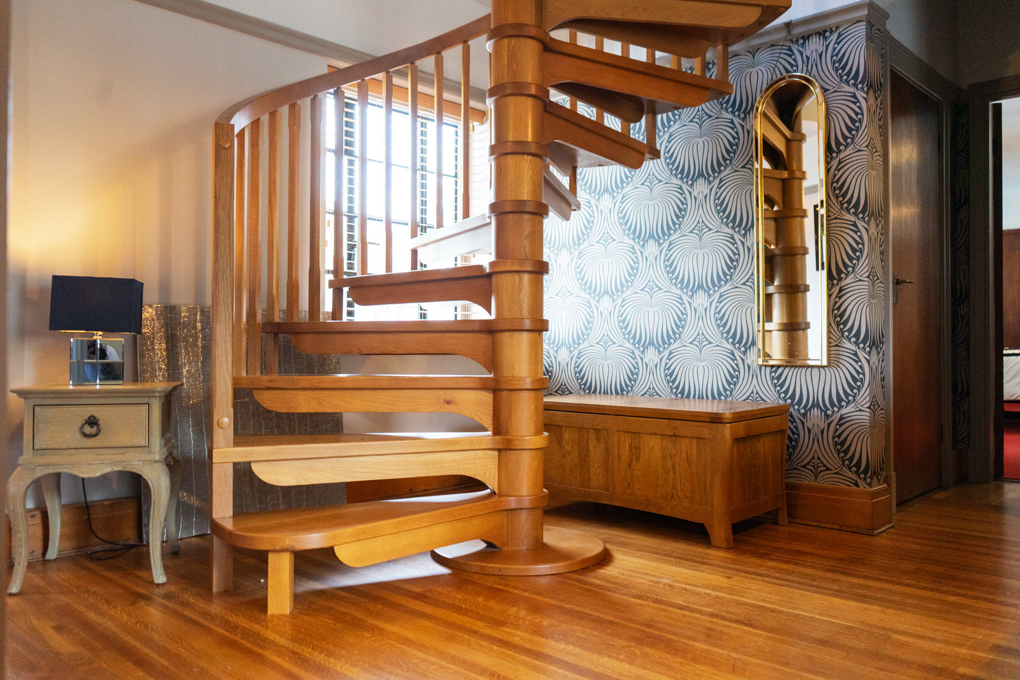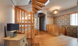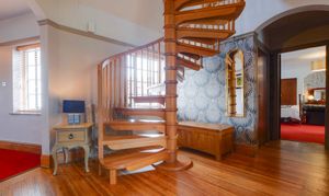 A lovely first floor landing with windows to the front and rear elevations, oak floor, spiral staircase to the second floor, picture rail, cast iron radiator.
