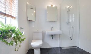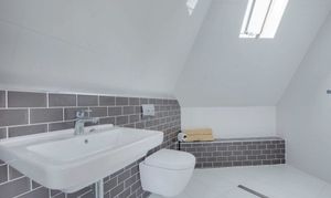 With skylight window to the front elevation, shower, low-level WC, wash hand basin, part tiled walls, tiled floor, chrome ladder style towel rail/radiator.