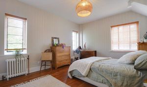 With windows to the front and side elevations, oak floor, wash hand basin with tiled splashback, cast iron radiator.