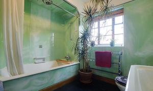 With window to the side elevation, bath with shower over, low-level WC, wash hand basin, tiled walls, chrome towel rail/radiator.