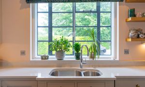 With windows to the side elevation, door to the side elevation, wall mounted boiler and Megaflow system, enamel sink with splashback, radiator.