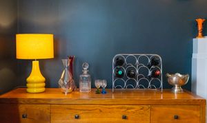 Irregular shaped. With window to the rear elevation, ceramic tiled floor, base unit with solid wood work surface over, shelving, cast iron radiator.