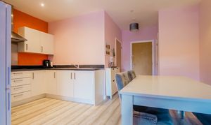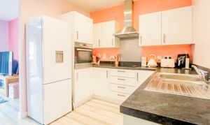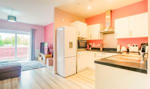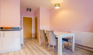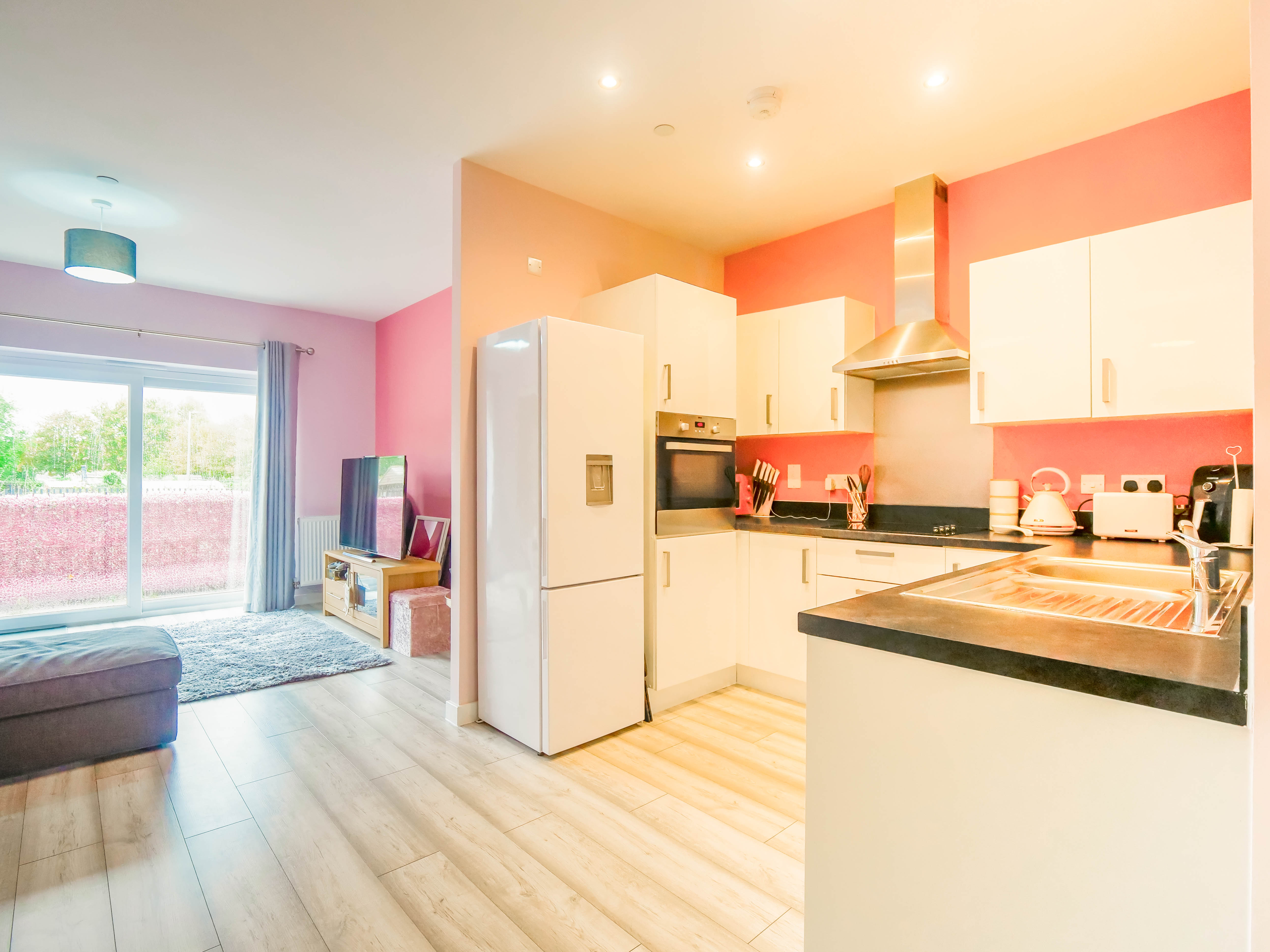 The moment you step into this apartment, it feels welcoming and spacious. The open-plan layout works perfectly here, with the kitchen, dining and lounge areas all flowing together naturally. The kitchen is smartly finished with sleek white units and plenty of counter space for cooking. Whether you’re enjoying a quiet night in or having a few friends over, the space just works.