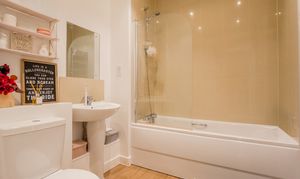The bathroom continues the modern theme with a clean white three-piece suite, full-size bath with overhead shower, and neutral tones. It’s fresh, functional and well-kept.